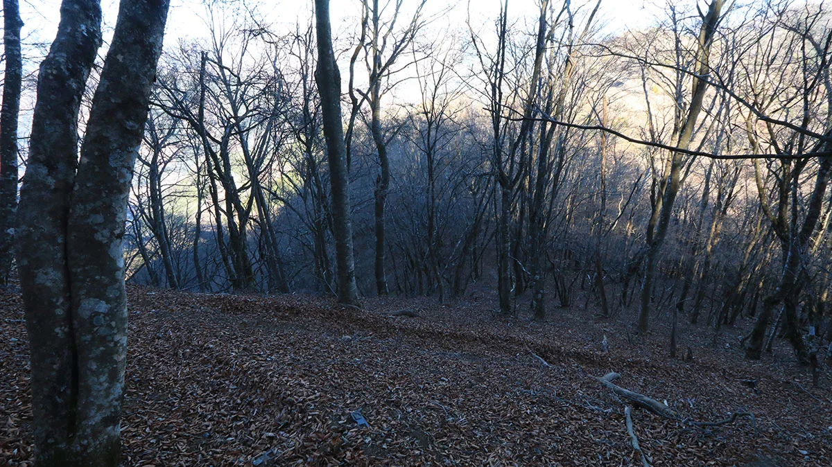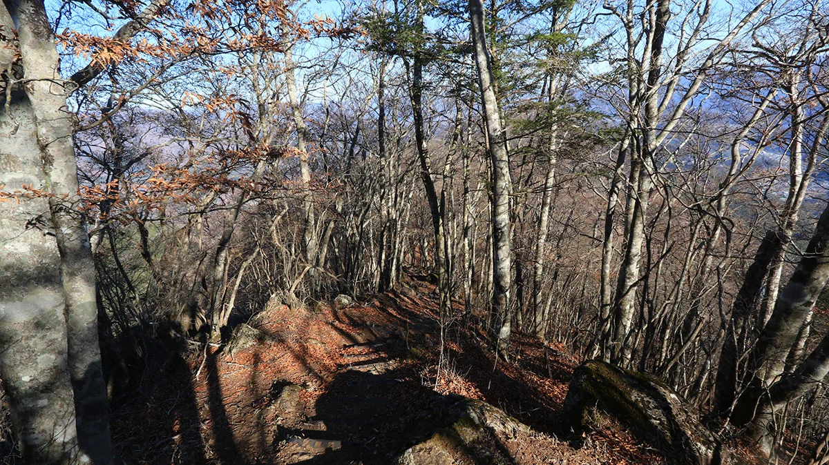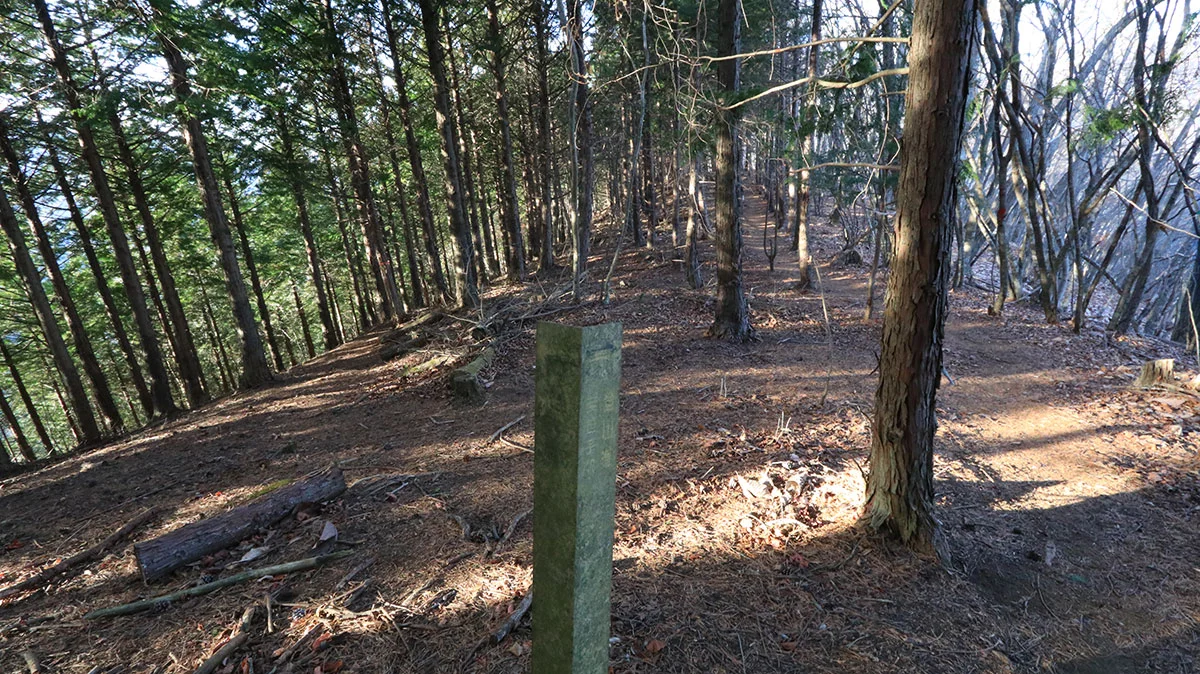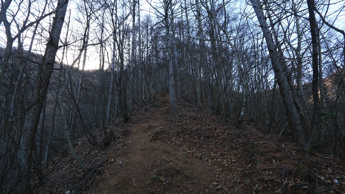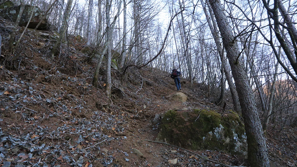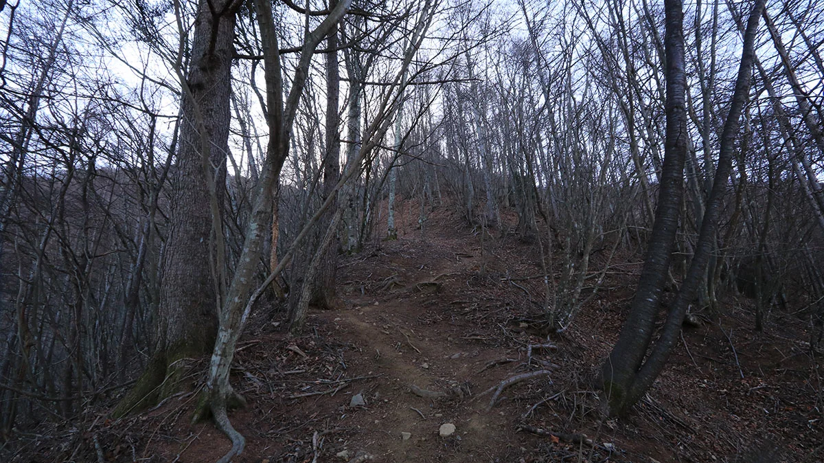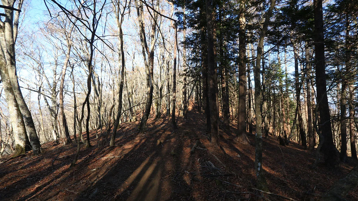 鹿よけの柵を出た後、清八山手前の分岐まで、大きく2ターンの上りとなる。1ターン目は、尾根を直登に登る道。それなりの傾斜だが、スタート直後で体力もあるので、難なくのり切る。