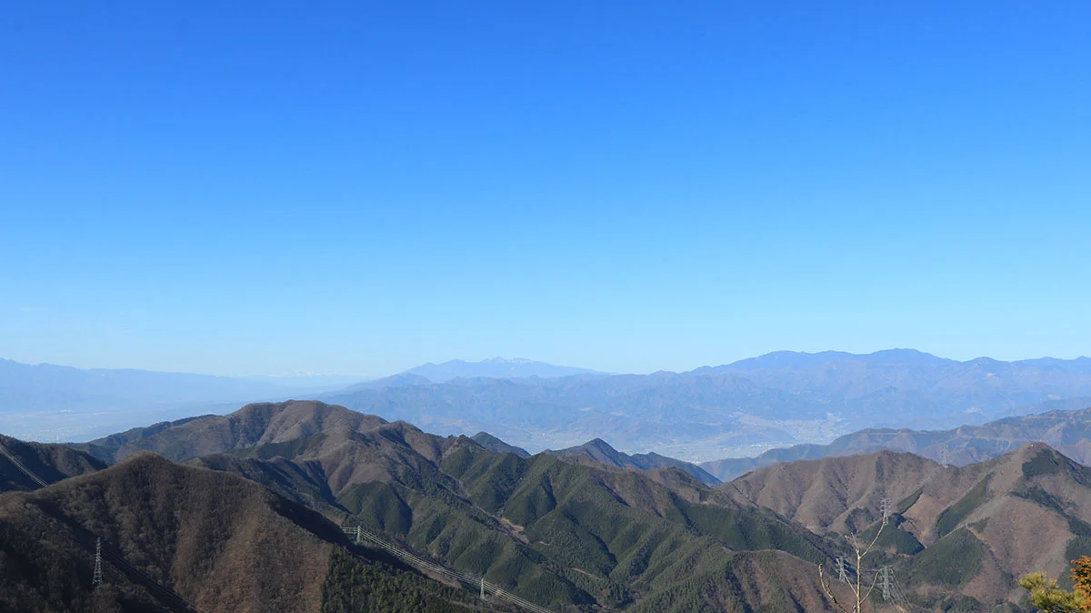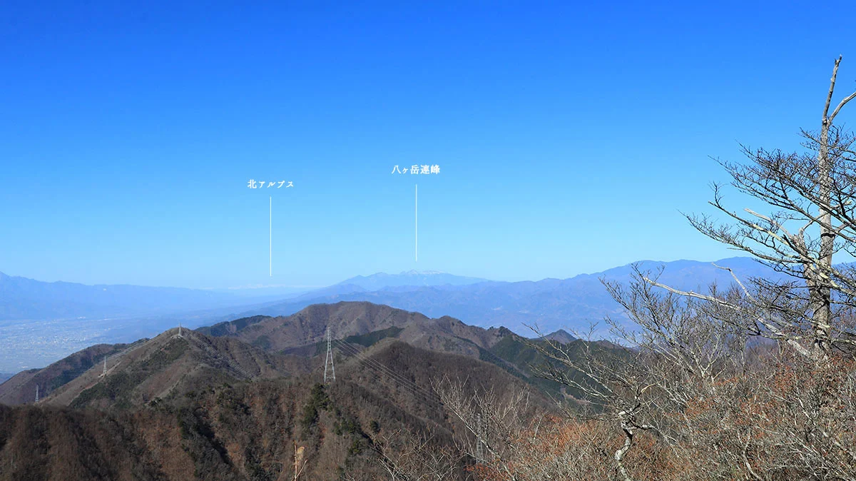 清八山からは西側を中心に、北から南にかけて扇形に景色がひらけている。富士山、甲府盆地に南アルプスの眺望が得られる。