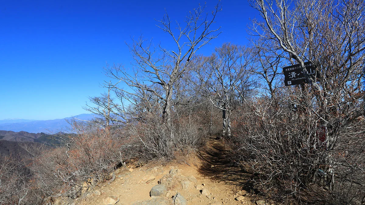 - 12月に入っているので、本来この時期は登山をしないのだが、12月にしては異例の暖かさで、天気予報も晴れだったので、急遽今年最後の登山として組み込んだ。今回も、2年ほど前から登っている大月市認定の「秀麗富嶽十二景」の山の中から、まだ登っていない12番山頂の本社ヶ丸・清八山を計画。