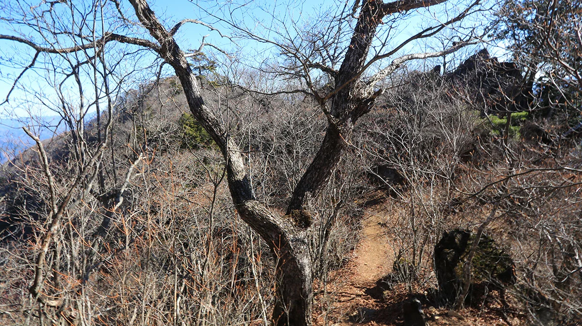 さきほどの分岐まで戻り、本社ヶ丸方面へ向かう。本社ヶ丸までの道だが、痩せ尾根で岩場、ロープ場もあり。滑落という観点においては、今回歩いたコース上で、注意が必要な区間。反面、岩場のある痩せ尾根なので、途中に見晴らしの良い場所もある。