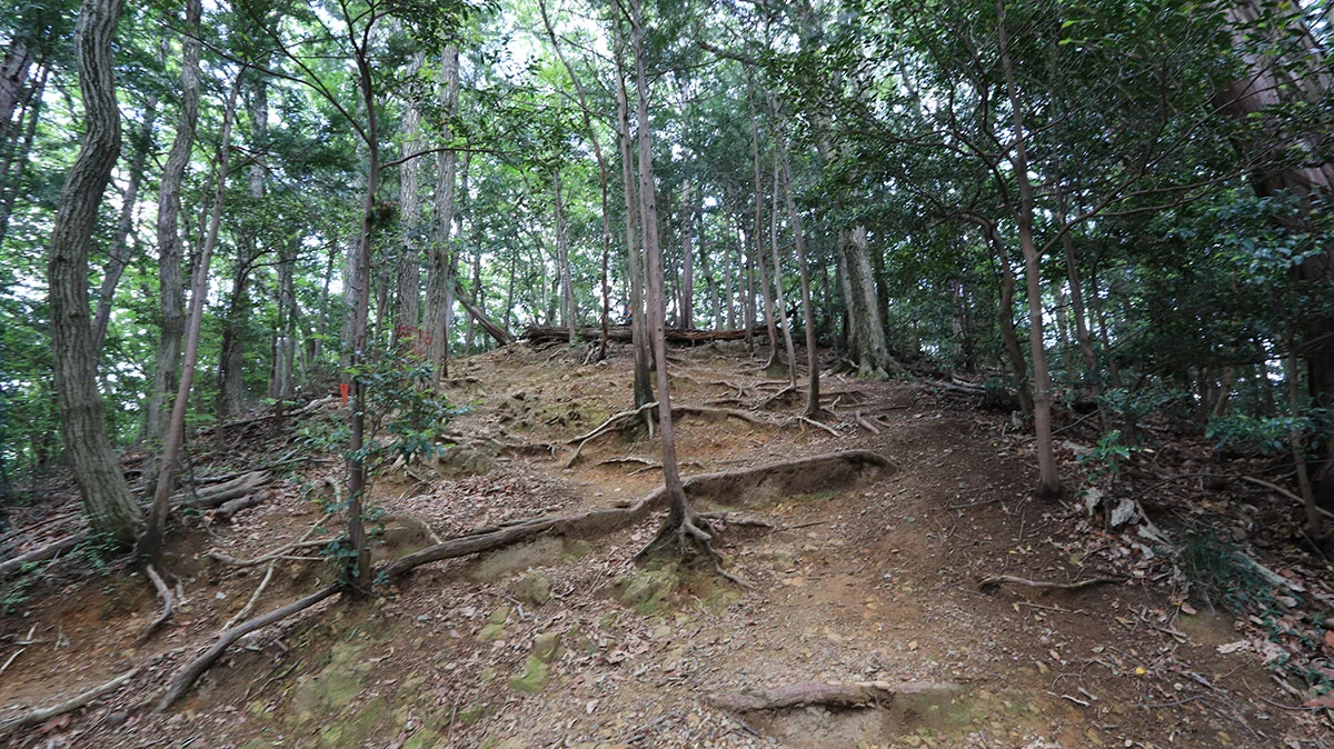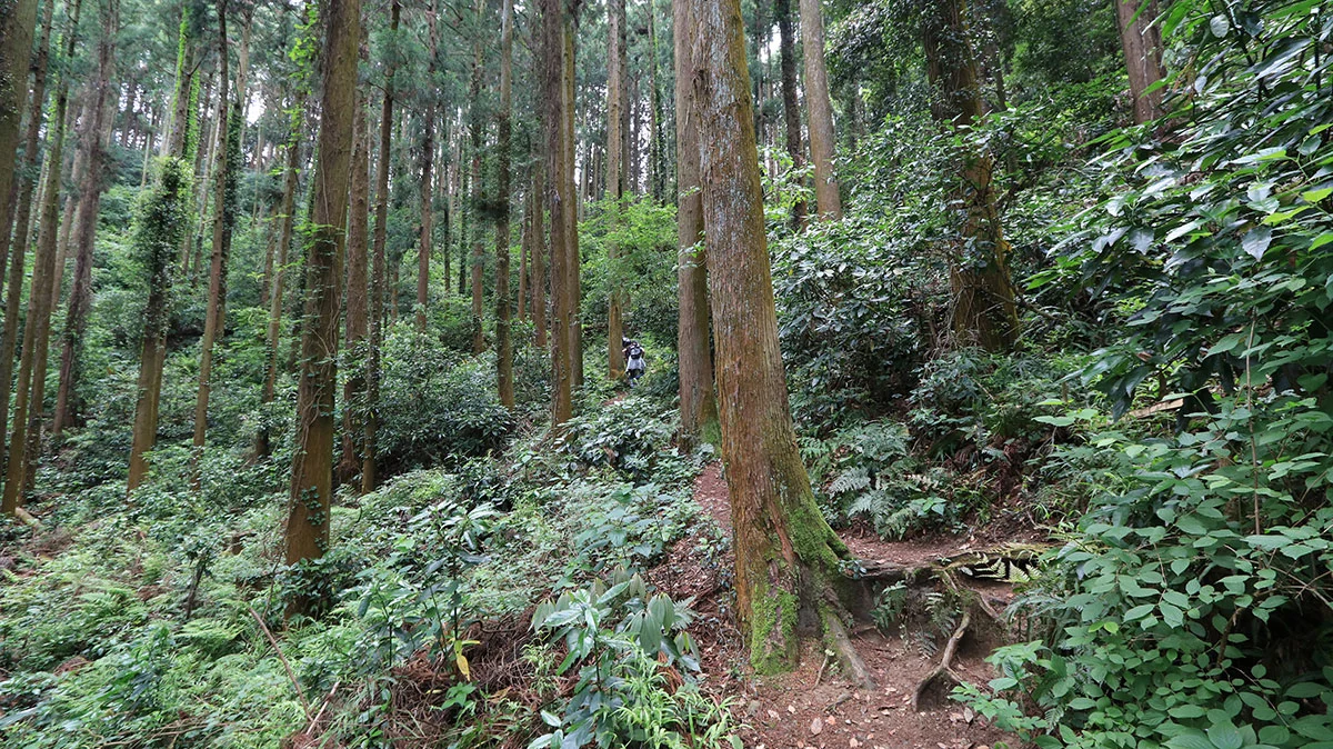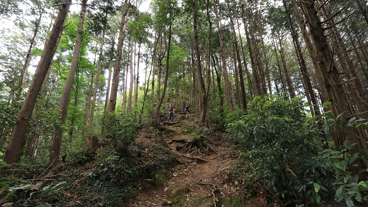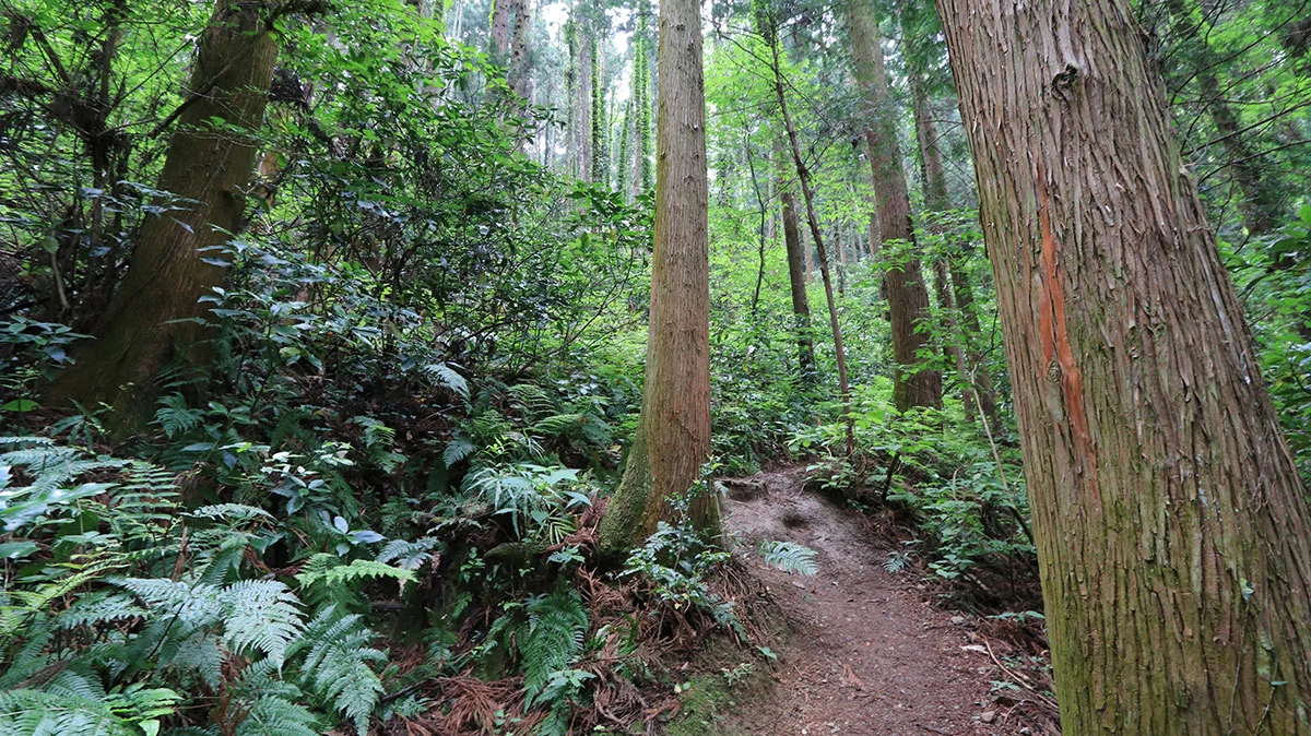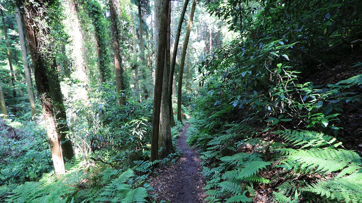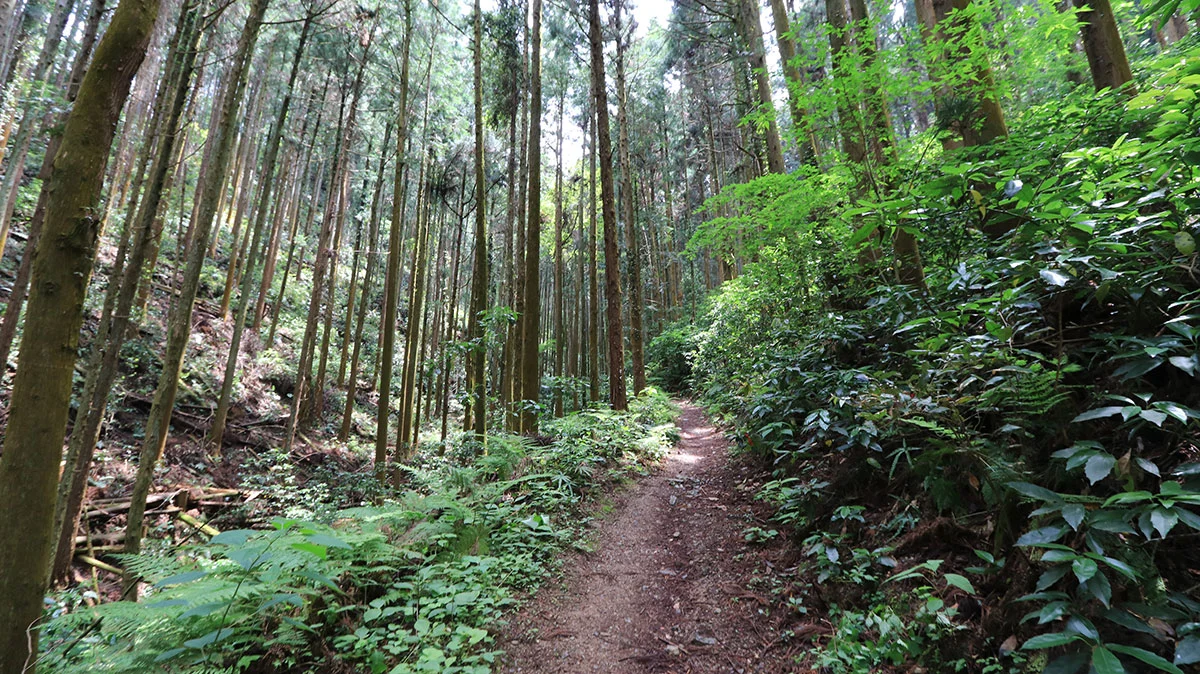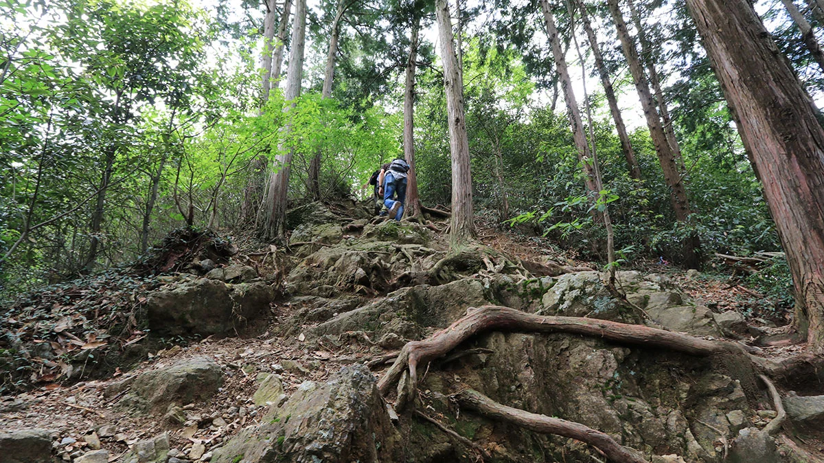 登山口からは本格的な登山道に。出発直後は、傾斜の緩やかな涸れ沢沿いの道を登る。傾斜が出始めたら道を左右に軽く振られながら官ノ倉峠まで登り詰める。