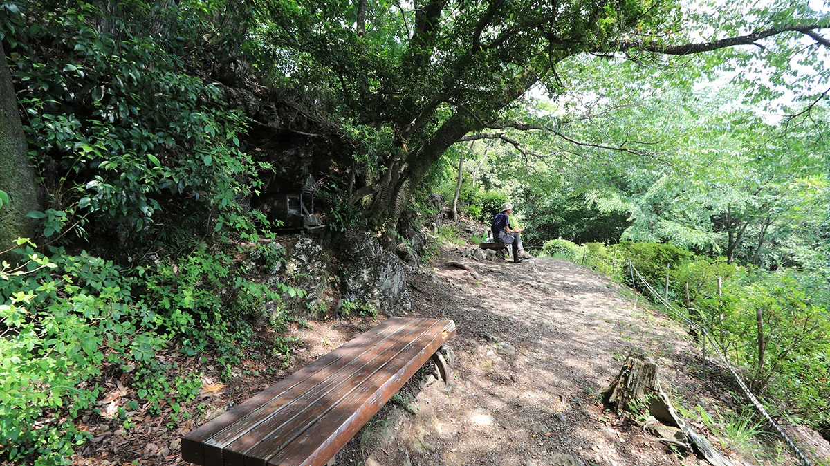登山口から30分ほどであっさり到着。「展望は良い」と聞いていたが微妙で、悪くもないが、特段良くもない。山頂スペースは10畳ほどで、ベンチが2基設置されており、極端に狭くもないが、広くもない。ただし、下山時に気づいたが、山頂の裏に祠があり、そこにも休憩できるスペースがある。