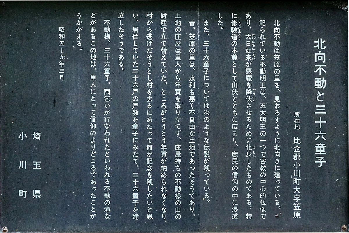 【13:58】北向不動・不動の瀧に到着。不動の瀧は木製のU字溝から流れており、瀧と呼ぶには少々オーバーな気もする。斜面を少し登ったところに、北向不動と呼ばれる社が祀られている。由来の看板を読んでもよくわからなかったが、一応貼り付けておきます。