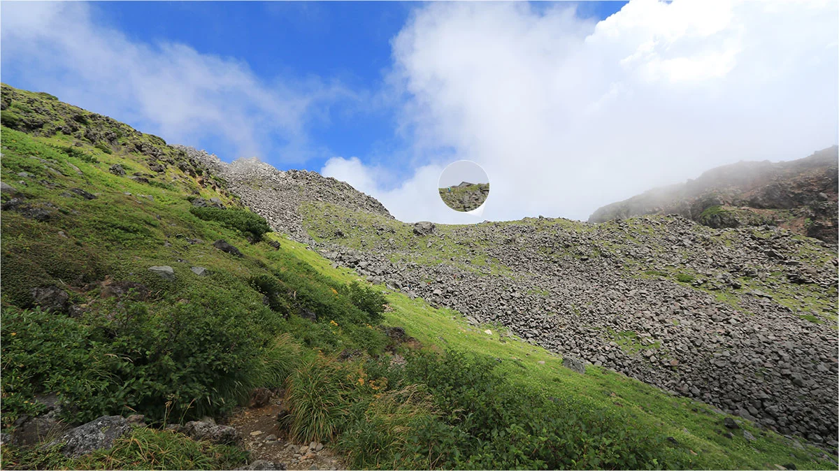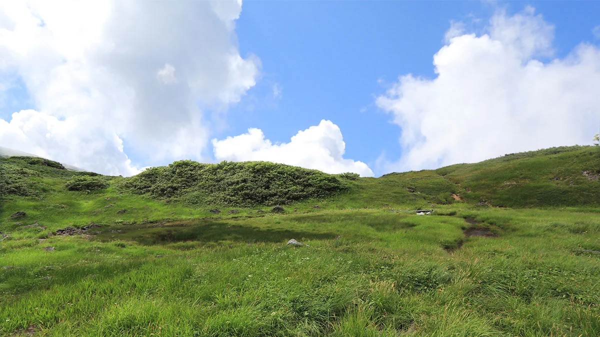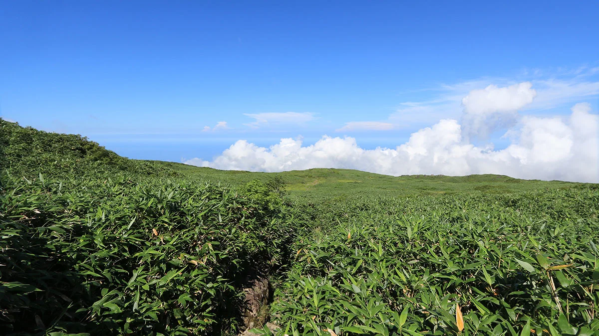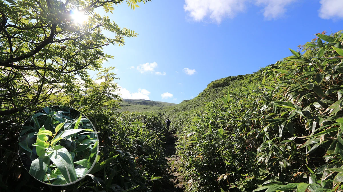 鉾立展望台から賽ノ河原までの道は、傾斜こそ緩やかだが日陰が一切なく、かなりというか相当暑い..。しかもこの時間帯は正面から直射日光をモロに浴びるので、体力的というより暑さバテ。そしてツラいのが、鳥海山の登山道は日陰がほとんどないので、休憩していても暑さから逃れることはできない。あまりにも暑いので、葉についている朝露の水滴で顔を洗い、少しでも暑さを和らげながら歩いた。