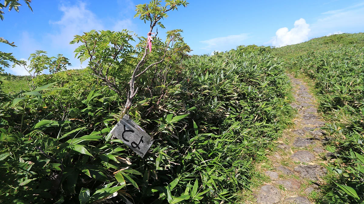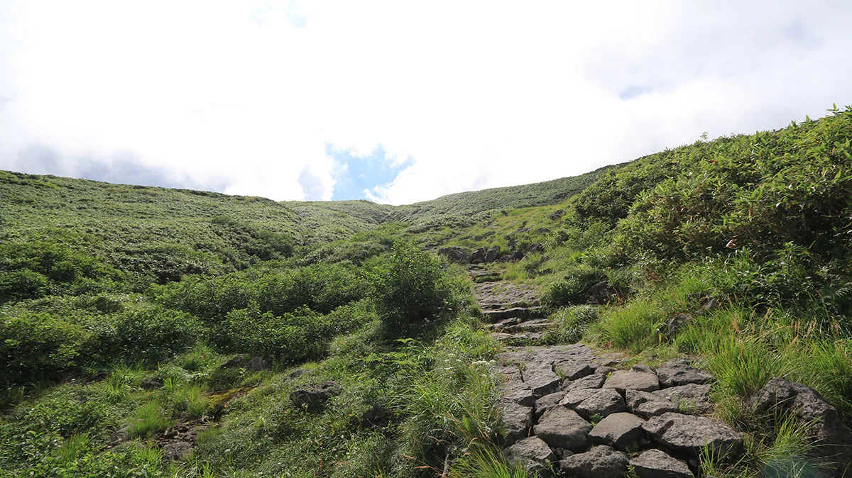 【8:50】賽ノ河原を出発。賽ノ河原出発直後の空は曇っていたが、それも数分だけで、すぐに陽の光が戻り、うだるような暑さに再びおそわれる。
