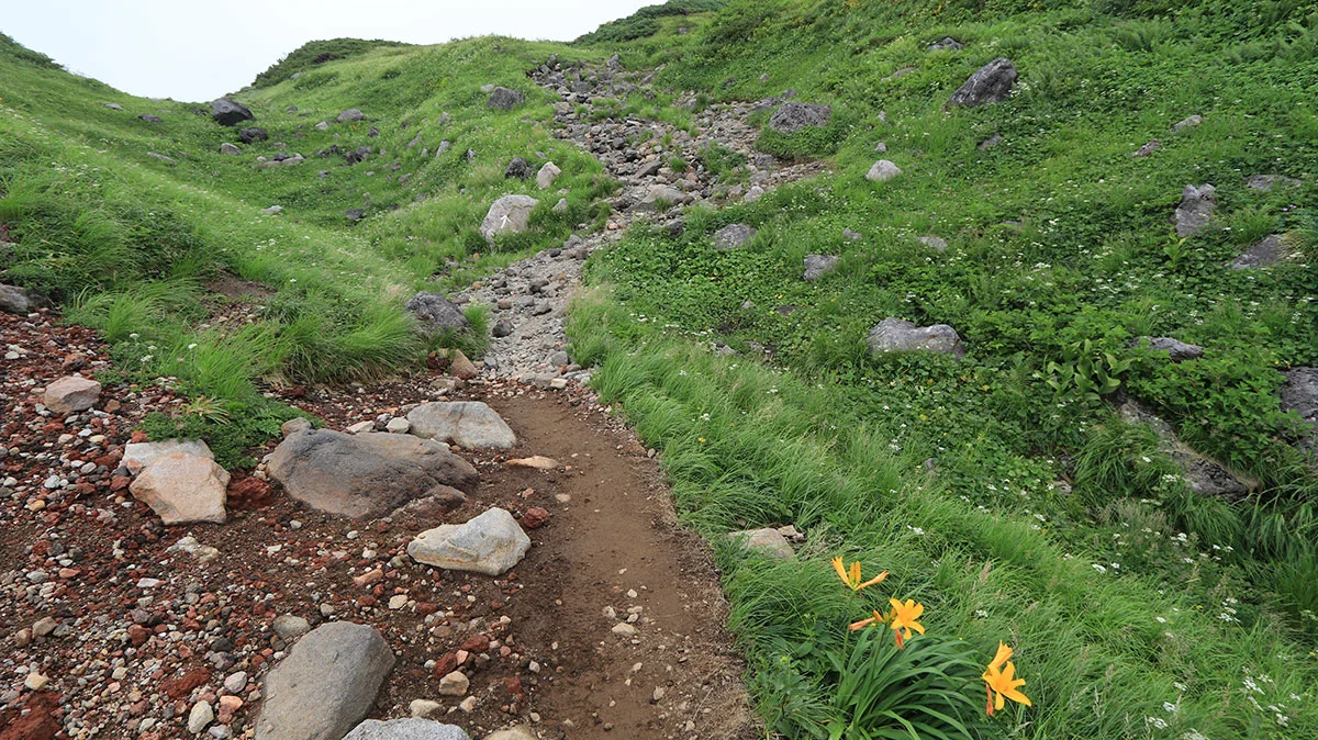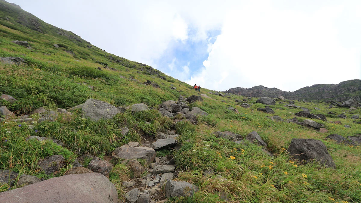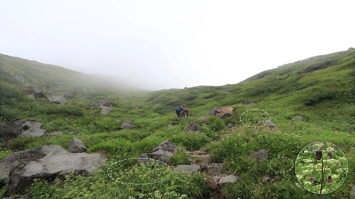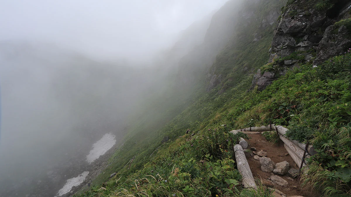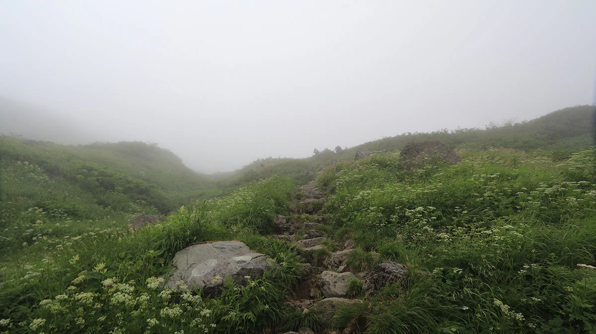 アルプスのカール地形同様に、この手の谷地形はとにかくキツイ。終盤の疲れたタイミングで現れる難所だが、ココを登りきれば本日のゴール地点なので、残る体力を振り絞りながら登る。ただプラス要素としては、霧で直射日光が遮られていたこと。この難所で直射日光にさらされると地獄。あと、千蛇谷は天然のお花畑状態になっており、たくさんの種類の花が咲いていた。