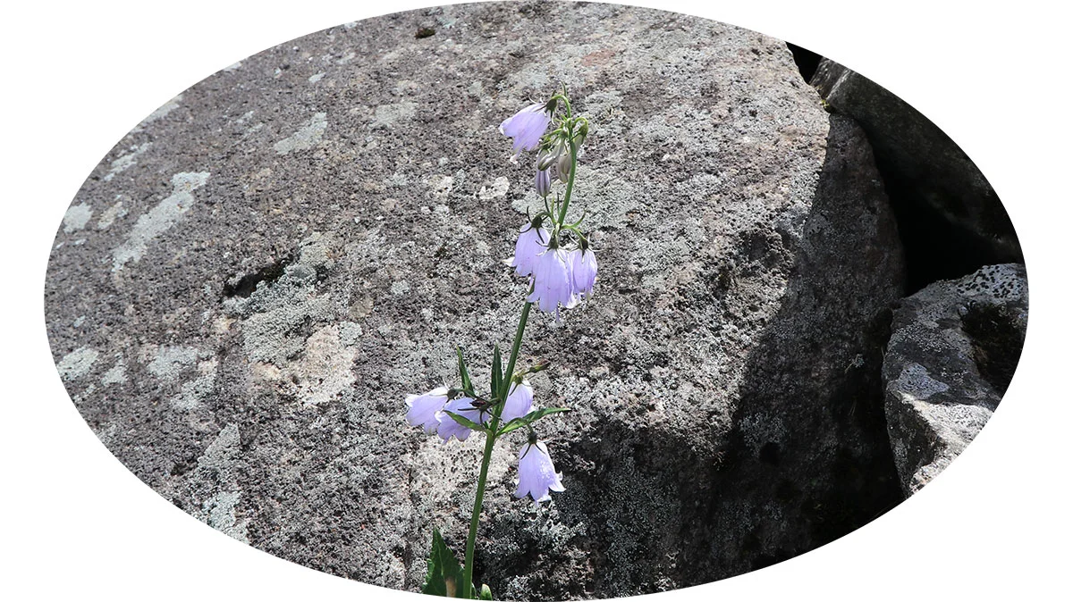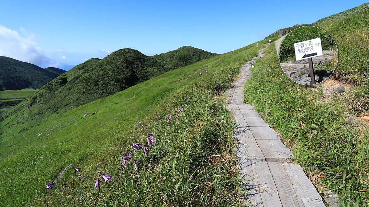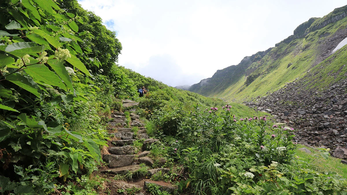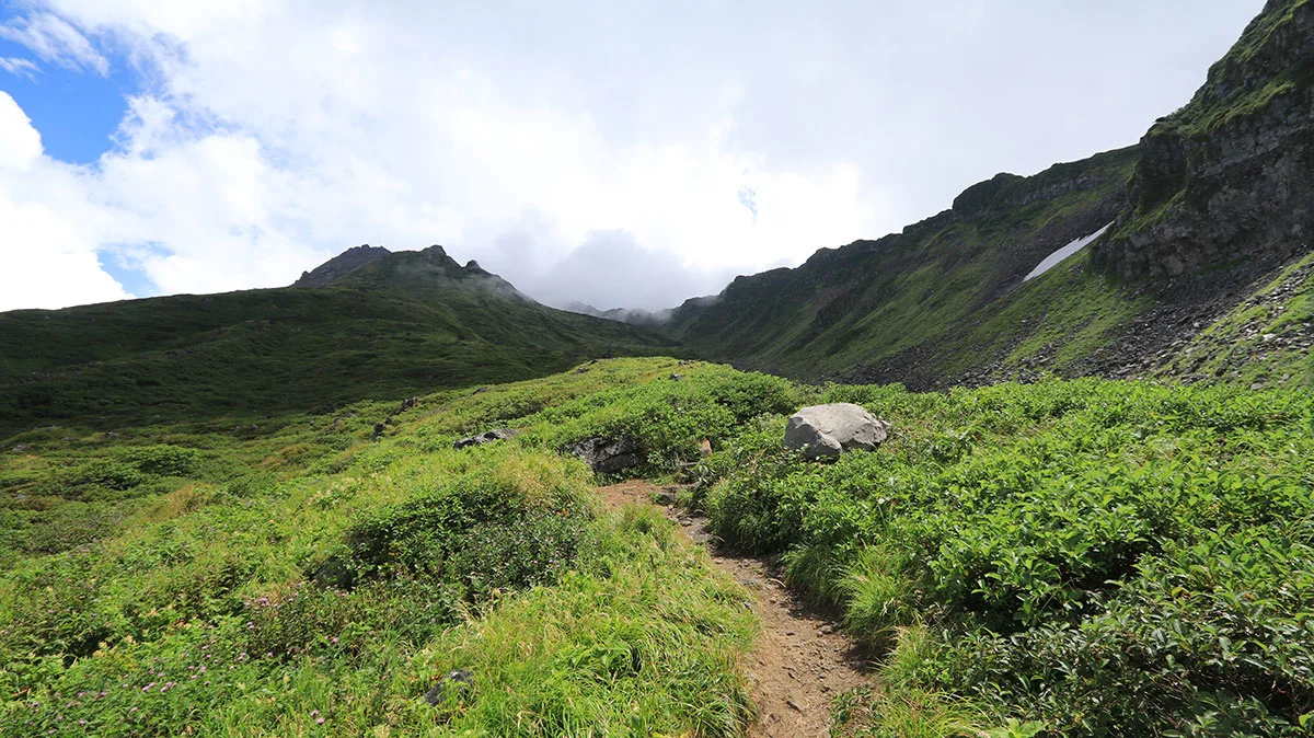 御田ヶ原を通り、七五三掛(外輪山と千蛇谷の分岐)を目指す。前半の御田ヶ原分岐までは緩やかな傾斜の道で、下りもあるなど、全体を通して体力回復ゾーン。また、御田ヶ原付近では、ハクサンシャジンが多く咲いていた。
