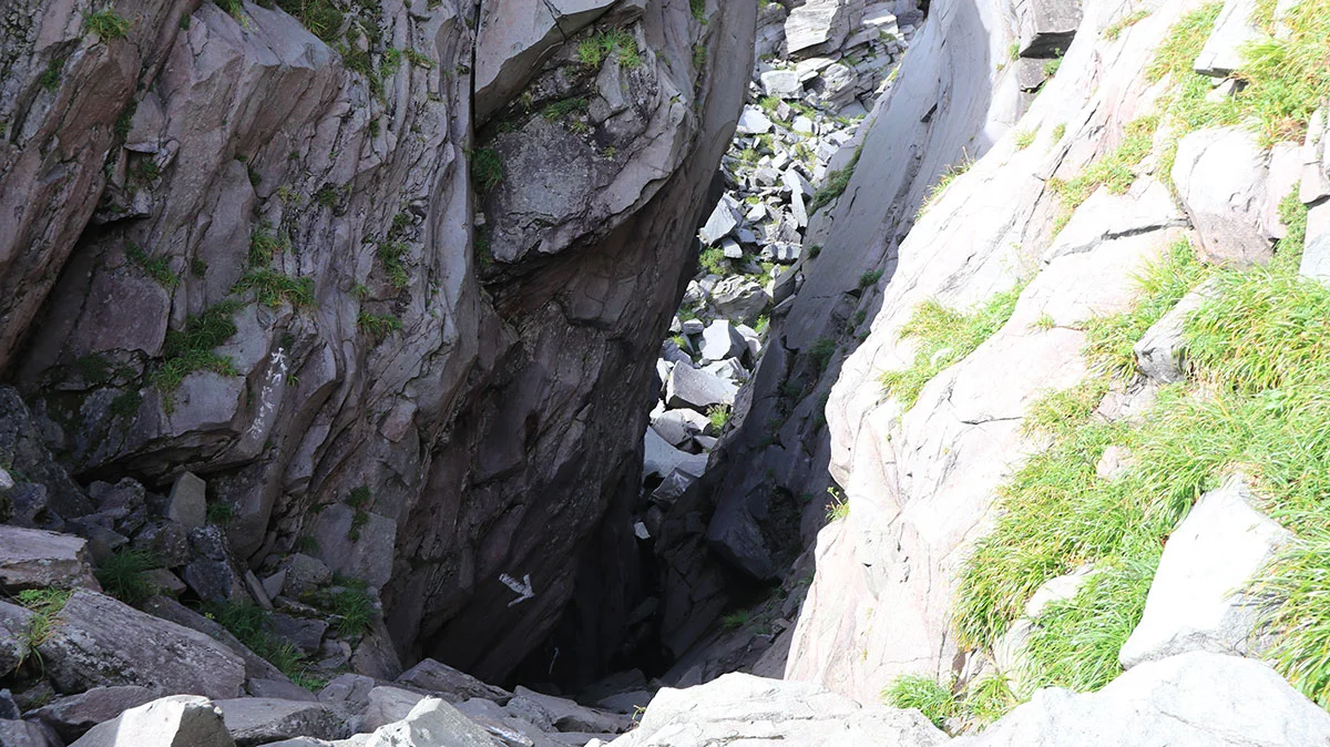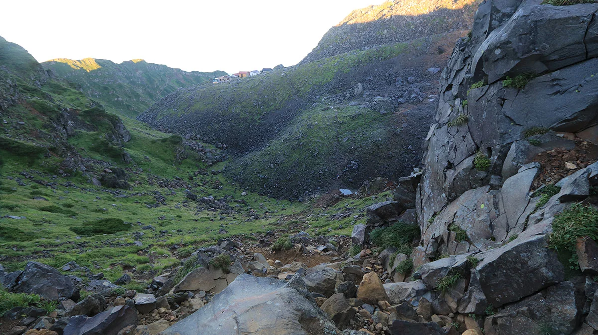 千蛇谷はU字状のきれいな谷地形。見た目には壮大な光景だが、しかし登山者にとっては鳥海山最大の難所。