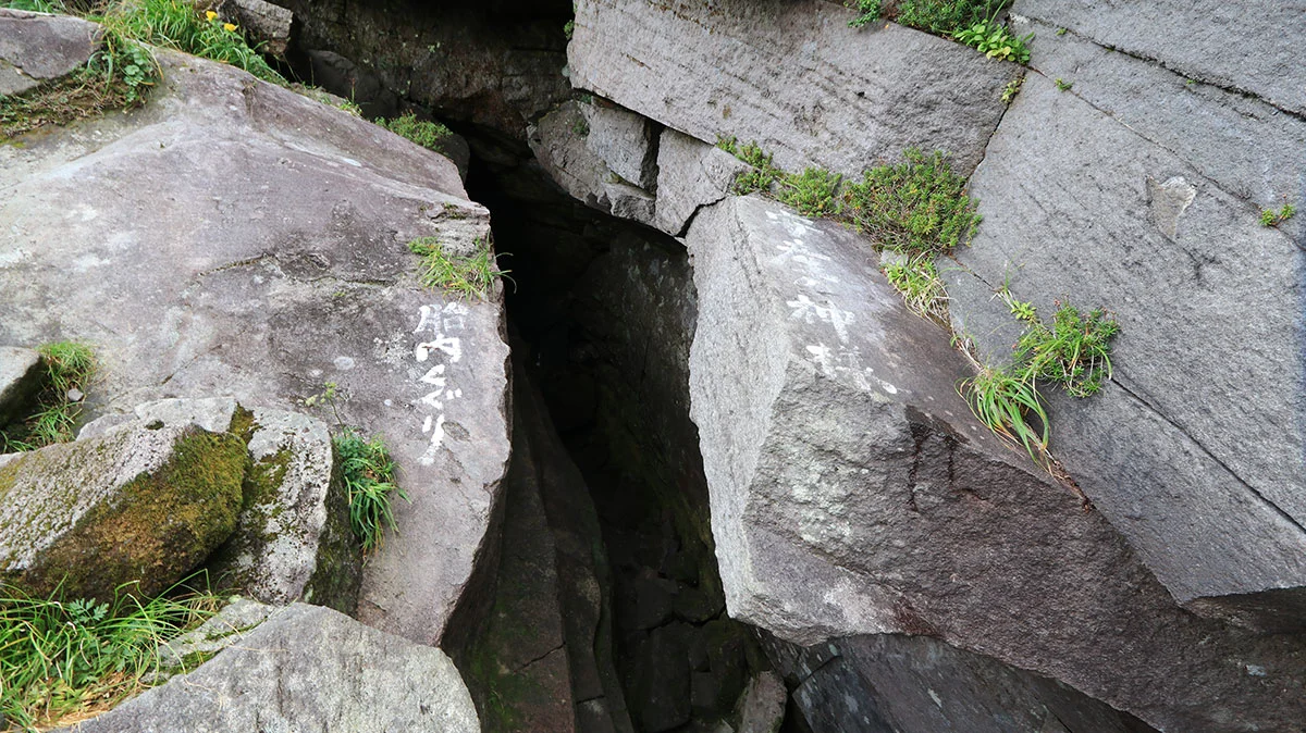 15時前頃、霧が少し晴れてきたので山頂へ。この時間になると日帰り登山者はすでに山頂周辺にはいないため、人も少ない。鳥海山の山頂は岩塊になっており、岩が積み重なってできている。
