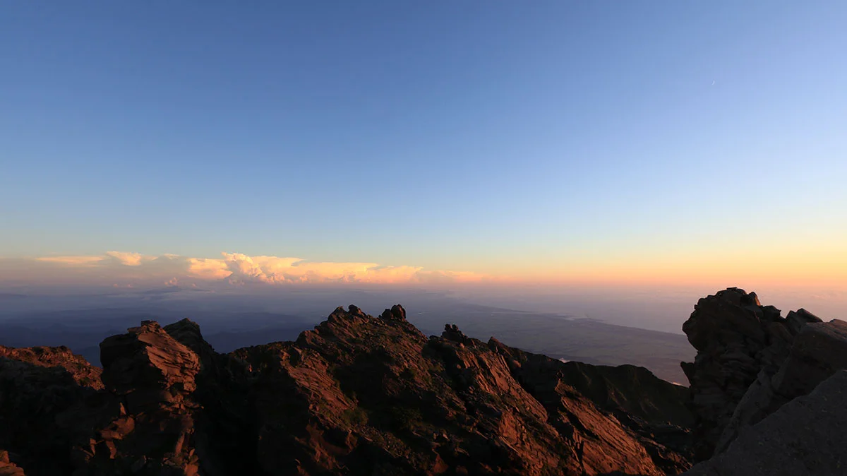 雲がまったくなかったので、最高のご来光でした。なお、日の出を撮影したのは厳密には七高山の山頂ピークより先に進んだ外輪山の先端。