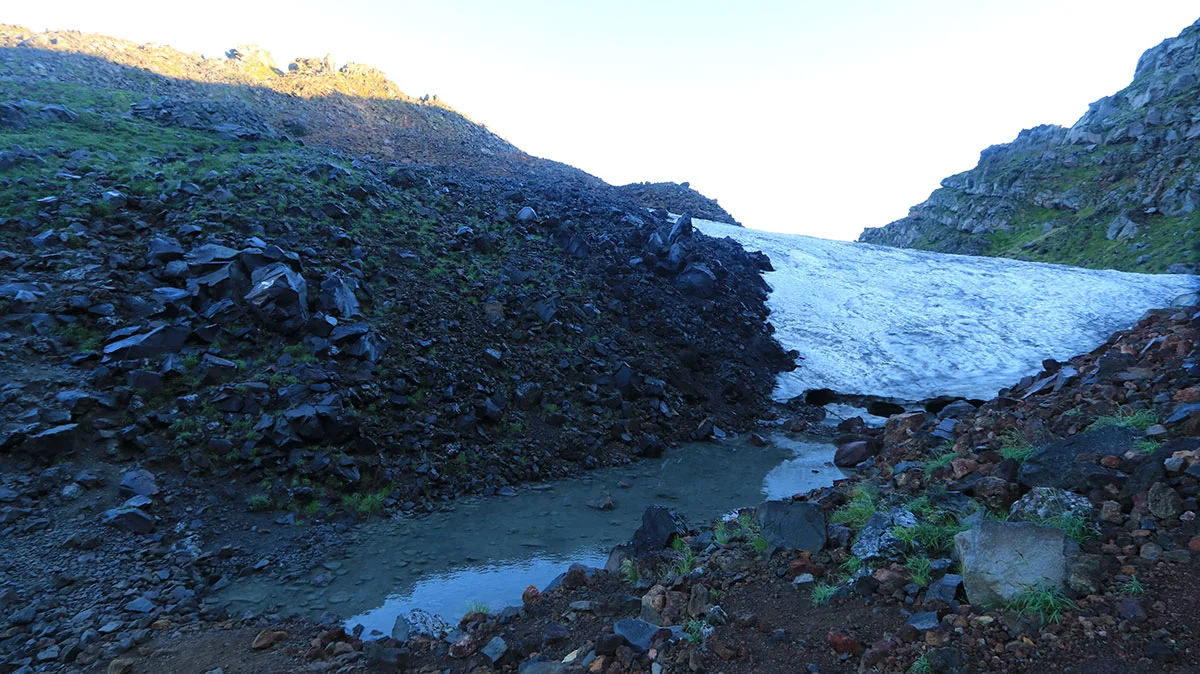 千蛇谷に進んだ直後に、まさかの雨に見舞われる。ここまで暑いと雨の方がマシのような気もしたが、ほんの数分で止んだしまった。あと、雪渓のほんの一部だが雪が残ってました。たまに雪渓から流れでる水を飲水(水場)としているケースもあるが、雪の量が少なく雪自体も汚れているので、飲水にできるような類の雪質ではなかった。