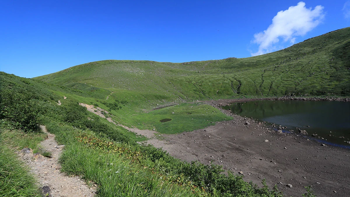 この道は鳥海湖の南側を進むが、北側の登山道よりも鳥海湖に近い場所を歩く。そのためか、前日に御浜小屋からみたときよりも鳥海湖の水量の少なさがより顕著に感じた。