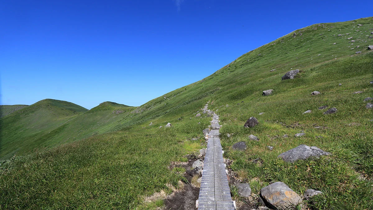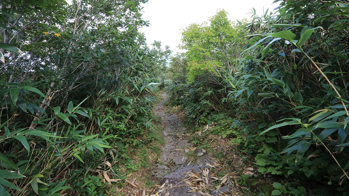 鉾立展望台以降は登山道。左奥の彼方に向かって進む。