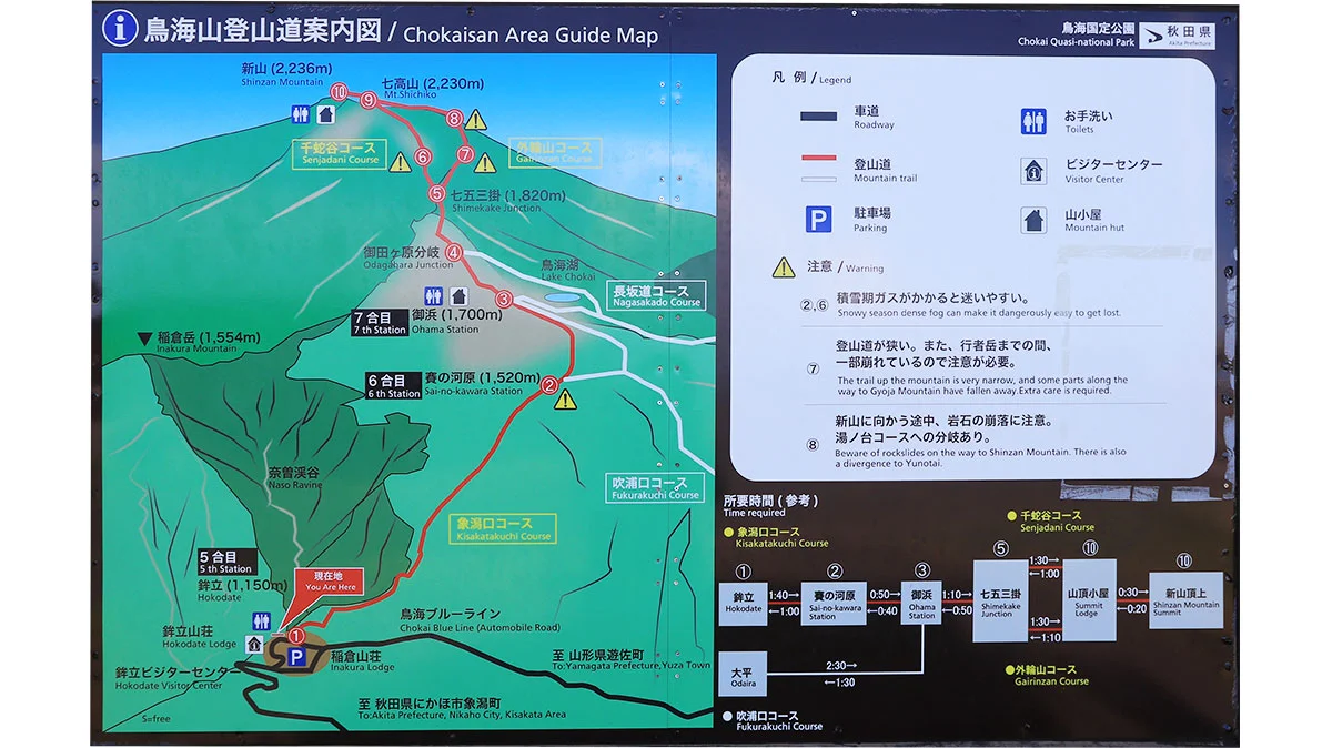 - 往路は鉾立口、復路は太平口に迷わず決定。理由は、鉾立口から登る象潟口コースの方がコースタイムが少し短かったことと、下山後に太平山荘の温泉に入りたかったため。ただ、温泉に関しては、この目論見は見事に打ち砕かけれる。(詳細はレポート参照)