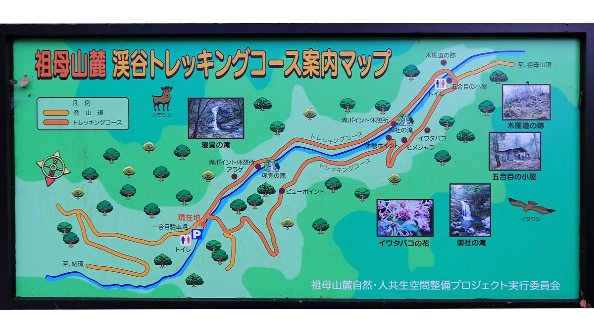 ちなみにカモシカ号は貸し切りでした。発着場にはカモシカ号の旗と「祖母山5.7km」と書かれた道標があるだけ。当初、カモシカ号の発着地点は「神の里交流センター」と勘違いしていたが、どう見ても施設があるような場所ではない。一先ず、道標があり進むべき方向は明確なので、先に進む。