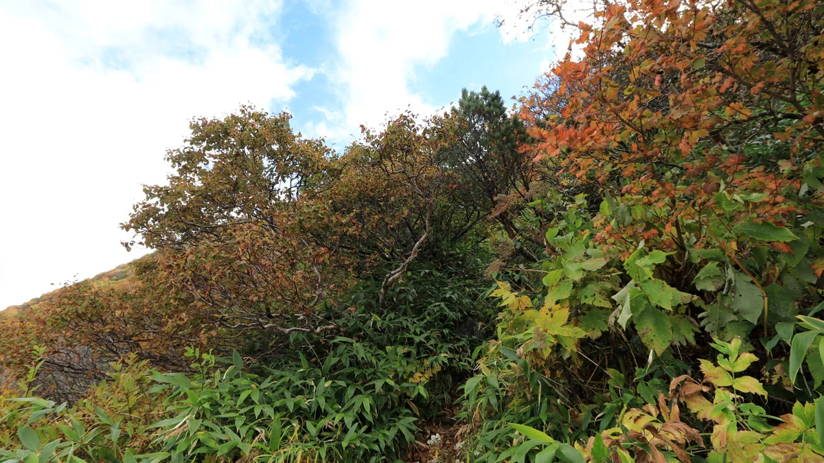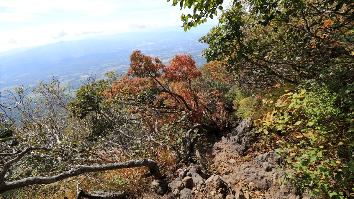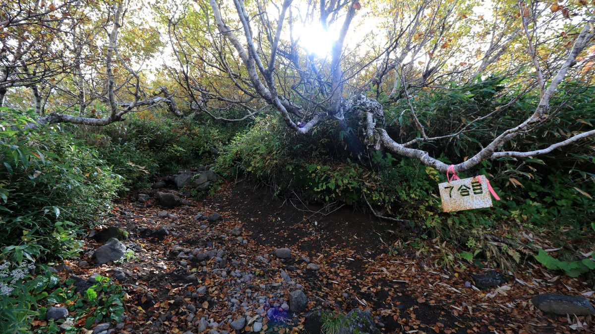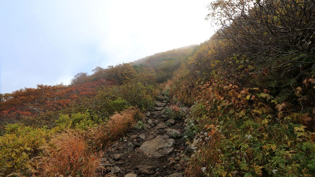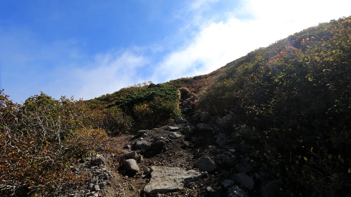 8合目あたりから、頭上が開けて成層火山特有の山頂が近い感が出始めるのと、紅葉で草木が色づき始めるなど、景色にも変化が現れる。