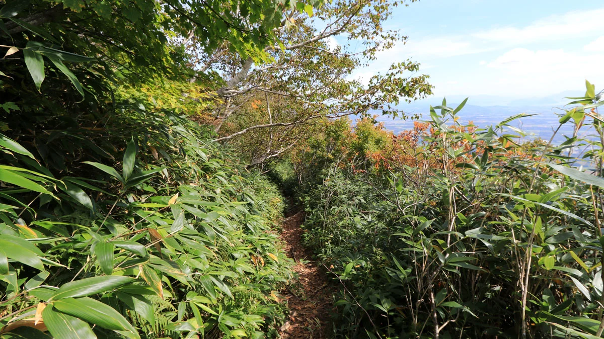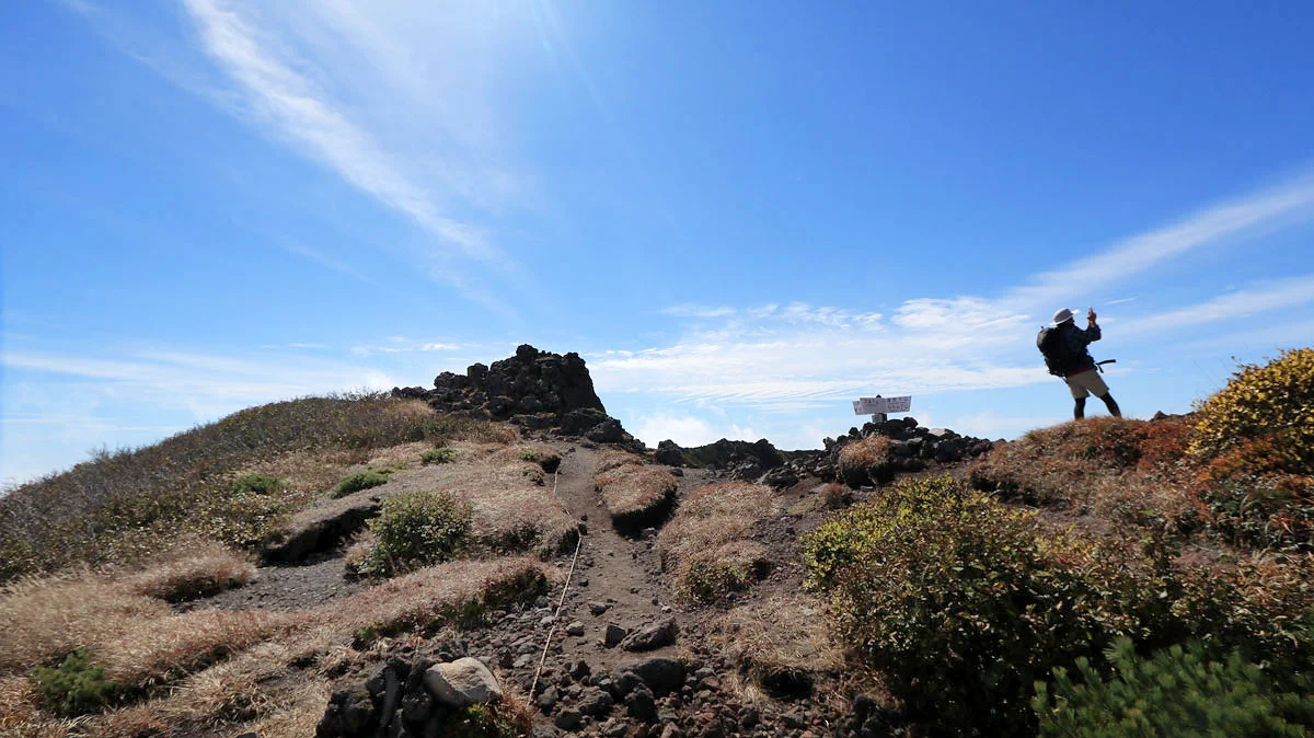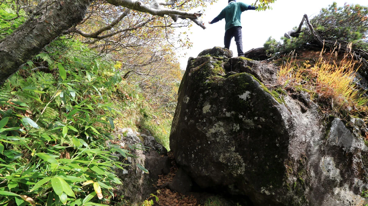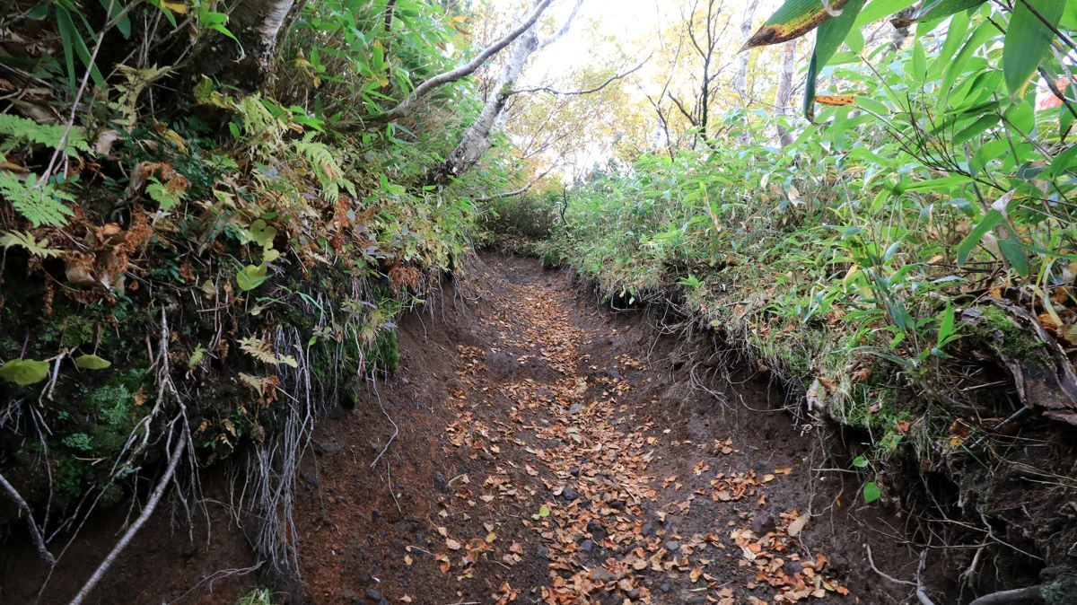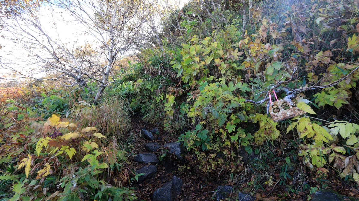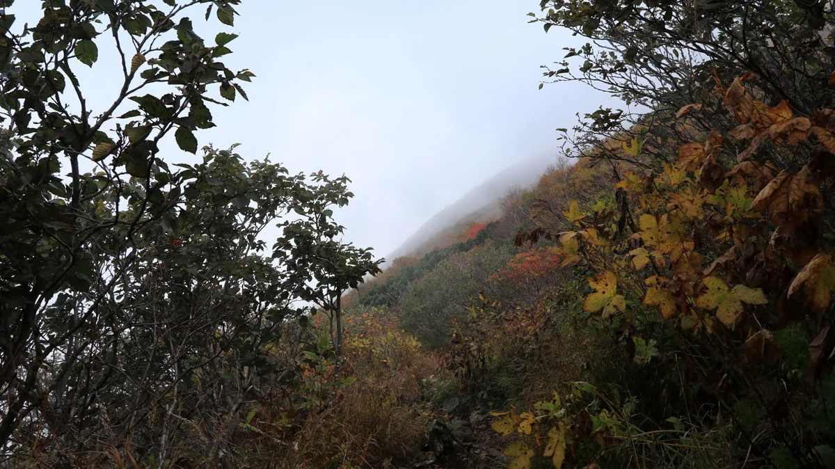 8合目あたりから、頭上が開けて成層火山特有の山頂が近い感が出始めるのと、紅葉で草木が色づき始めるなど、景色にも変化が現れる。