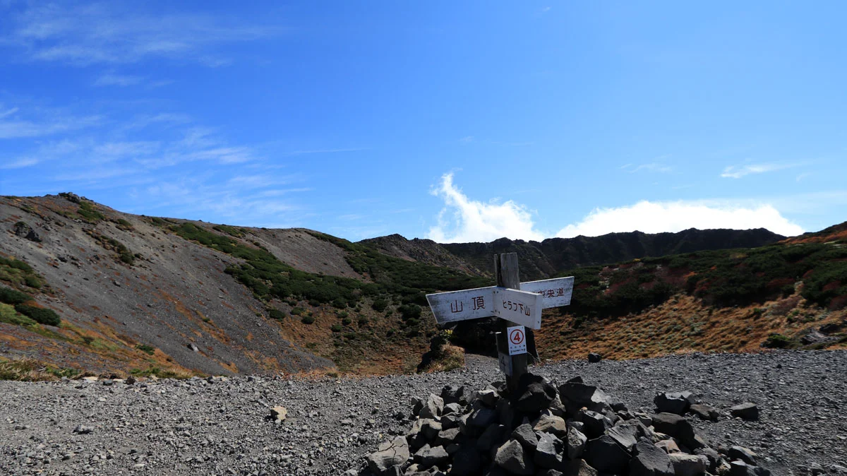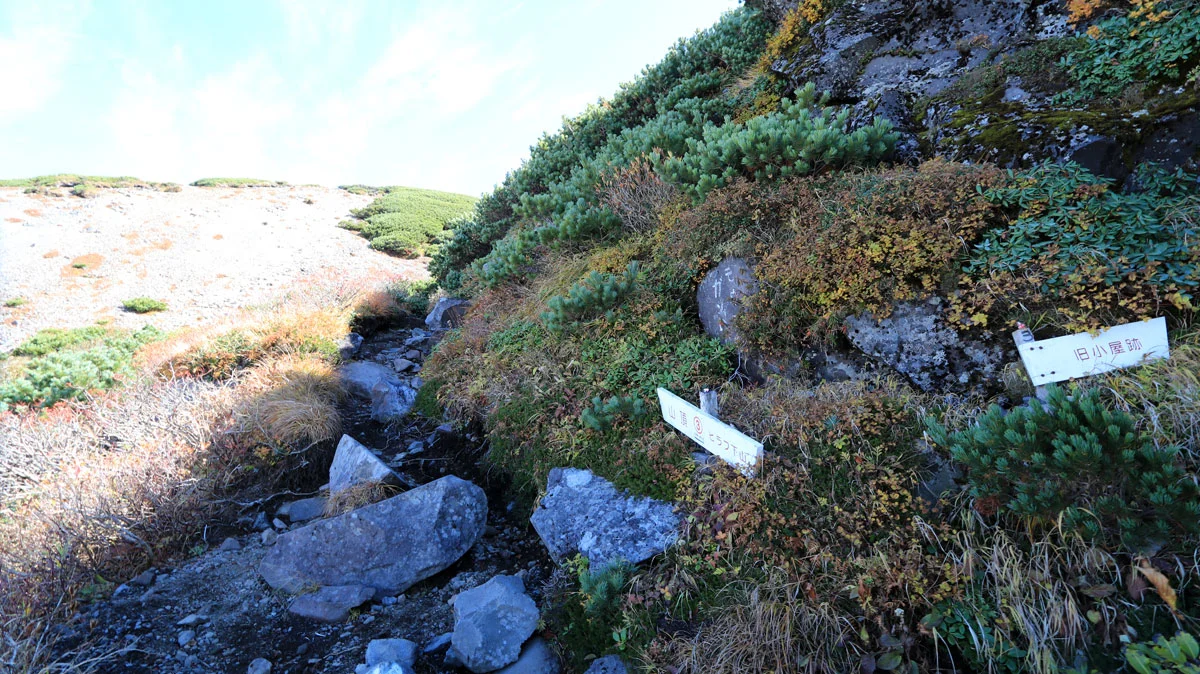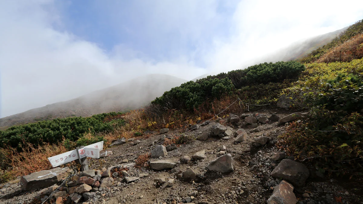 コースタイム4分巻き返したため、9合目で5分ほど休憩。到着直後は霧に覆われていた9合目だが、休憩している間に天候回復。ちなみに、9合目は羊蹄山避難小屋への分岐地点でもある。