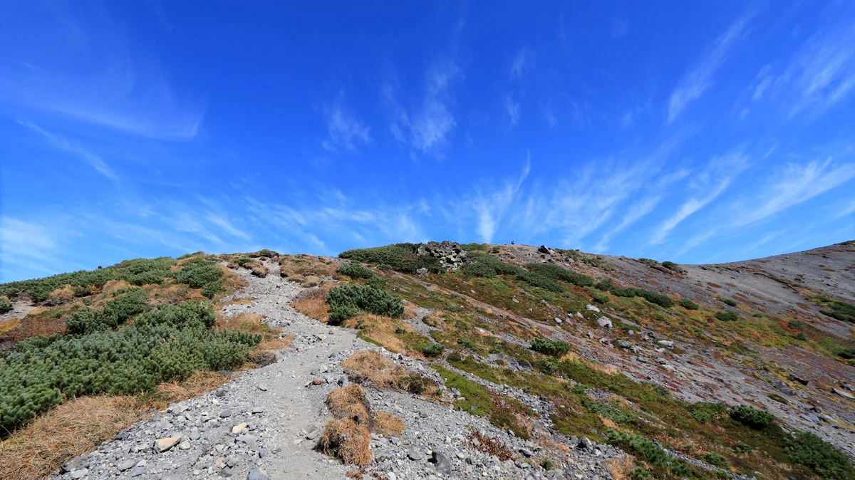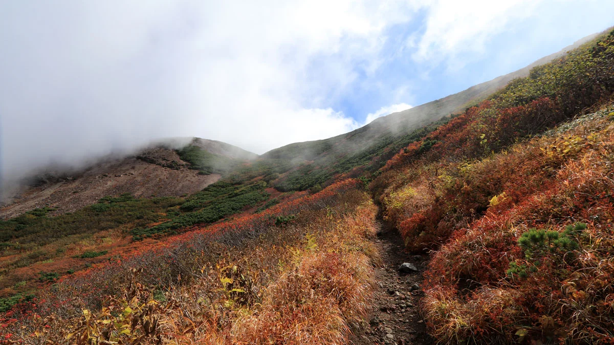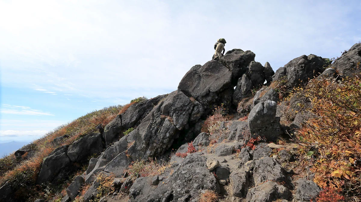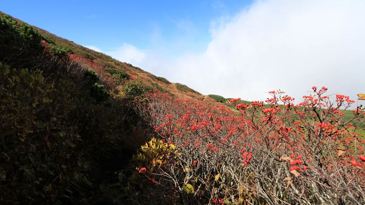 この区間は最後の難所。ココを登ればあとは火口の縁を歩くだけなので、最後の力をふり絞って登る。でも、この区間は草紅葉に大量のナナカマドの実などに加え、開放感もあるので素敵ゾーンでもある。