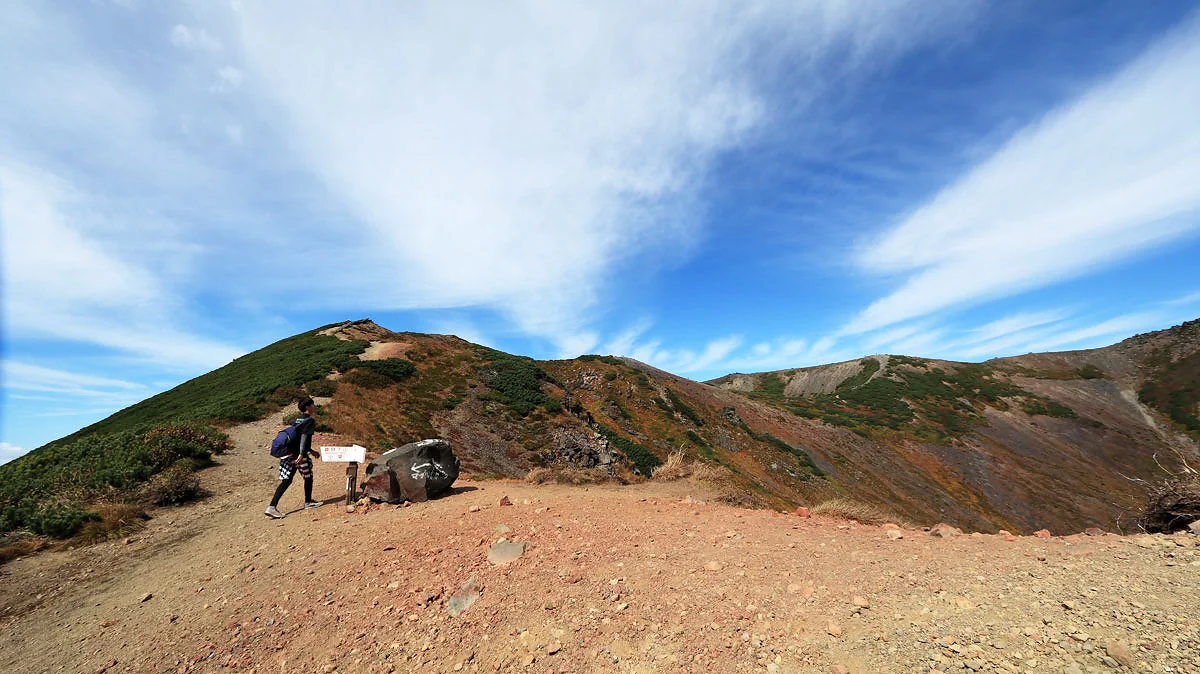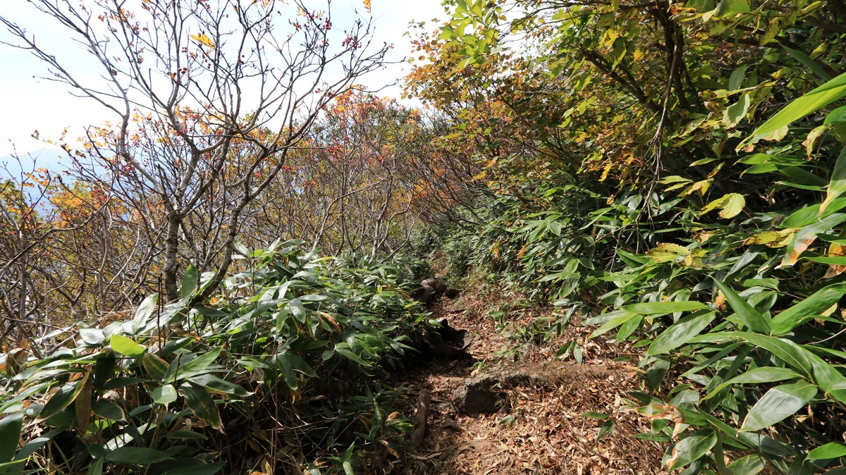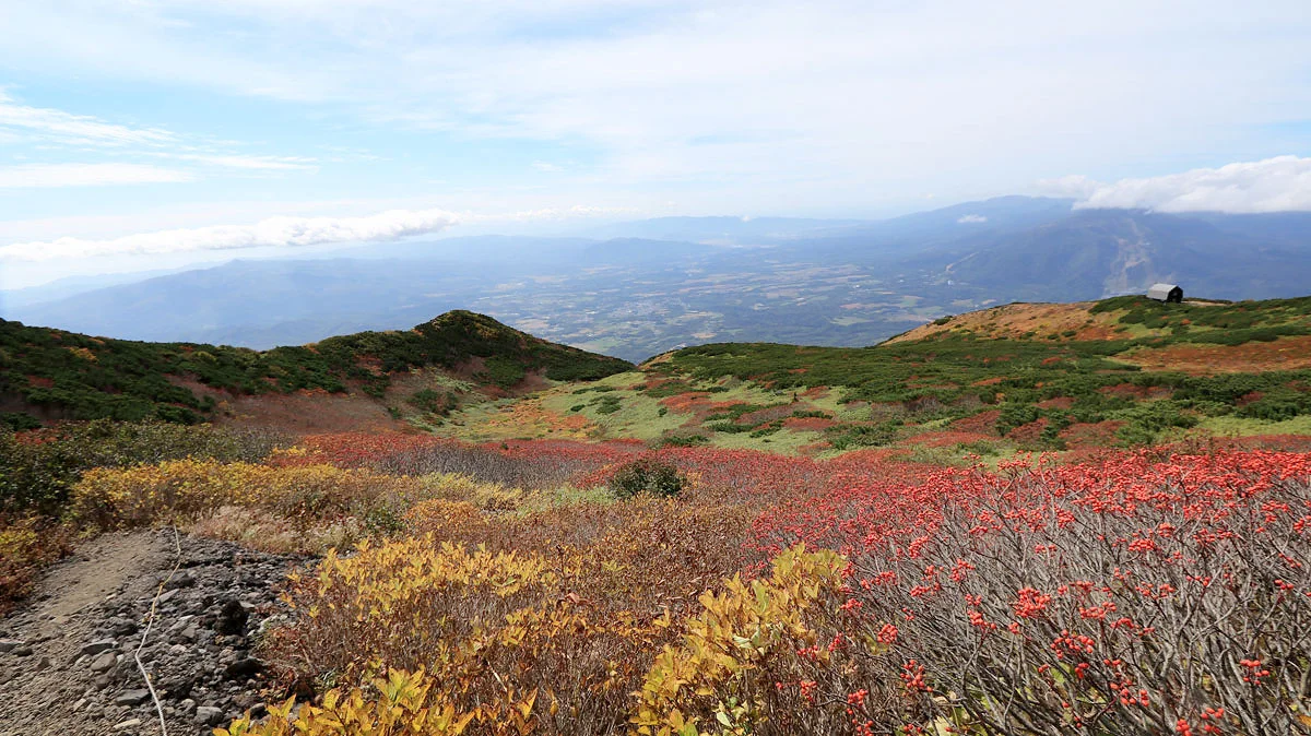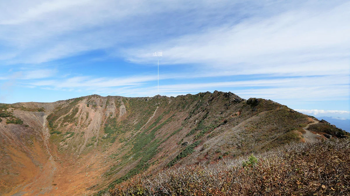 この区間は最後の難所。ココを登ればあとは火口の縁を歩くだけなので、最後の力をふり絞って登る。でも、この区間は草紅葉に大量のナナカマドの実などに加え、開放感もあるので素敵ゾーンでもある。