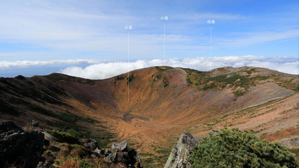 山頂には直径700m・深さ200mの父釜があり、西北西斜面に側火口の母釜と子釜がある。