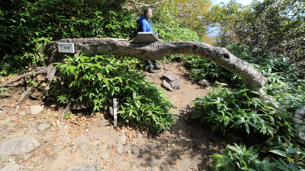 予定より約5分遅れ。疲れがコースタイムの遅れに出てきている。ちなみに6合目だけ標識ではなく、ペンキだった。