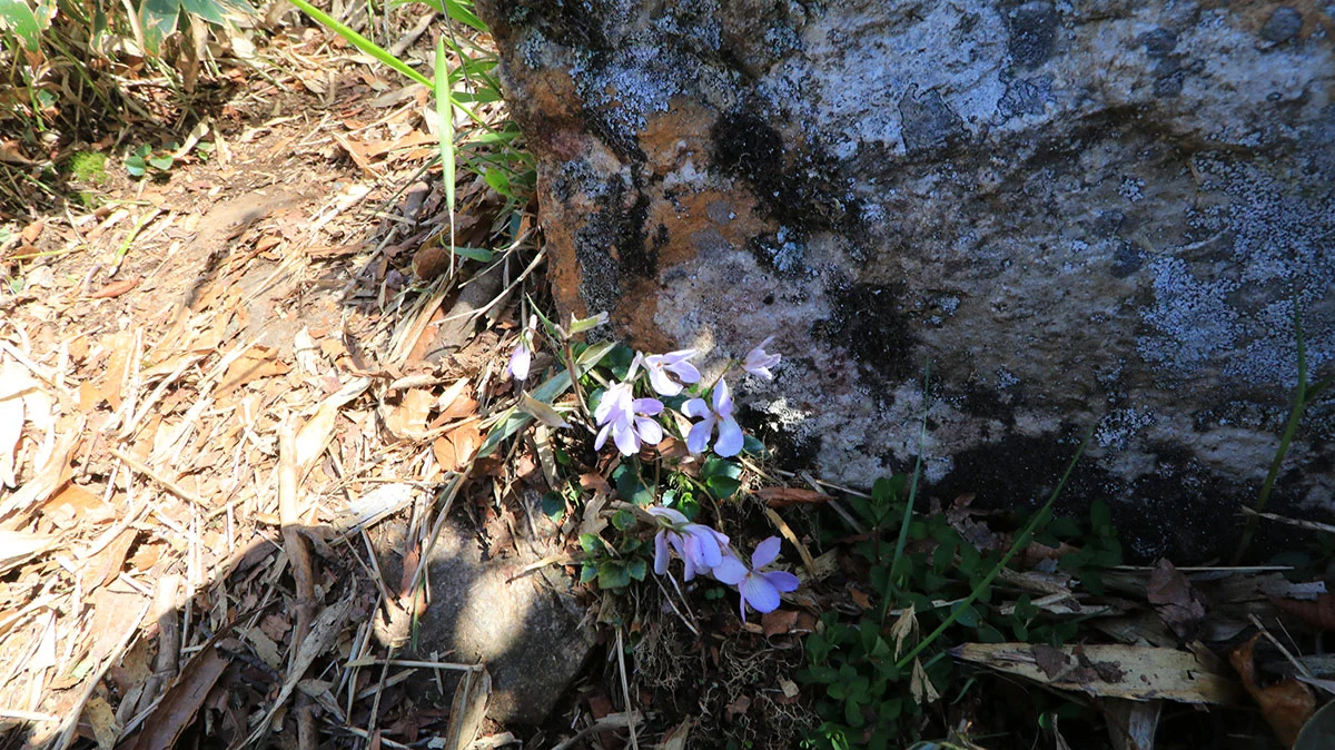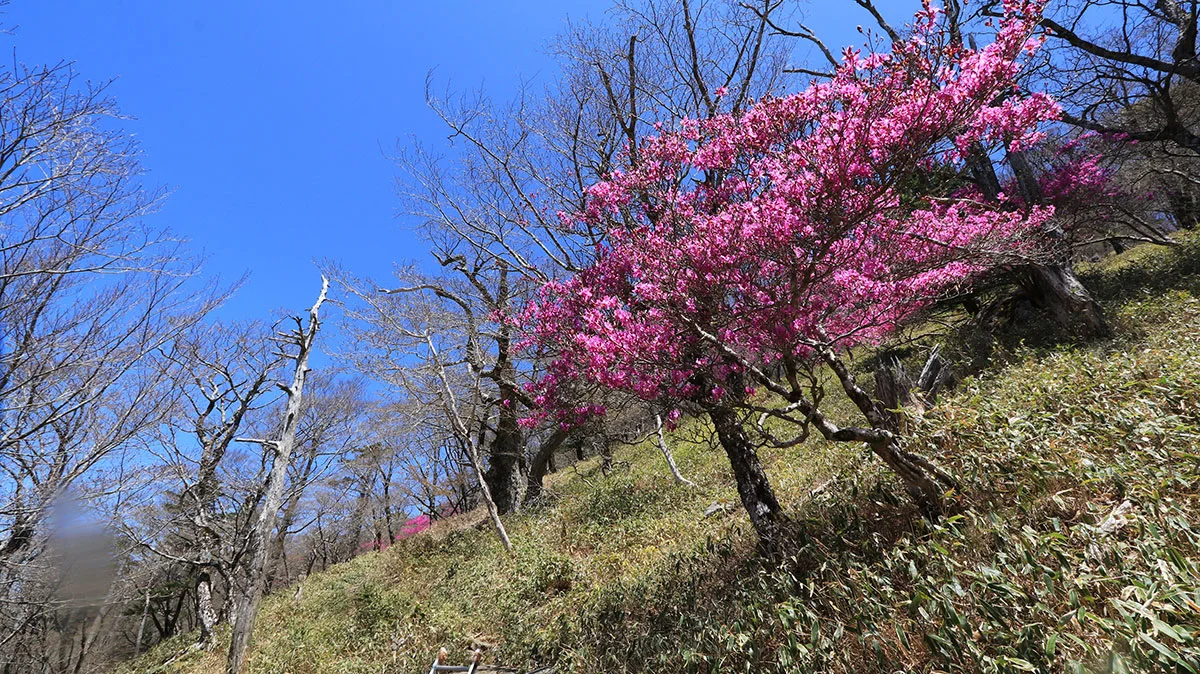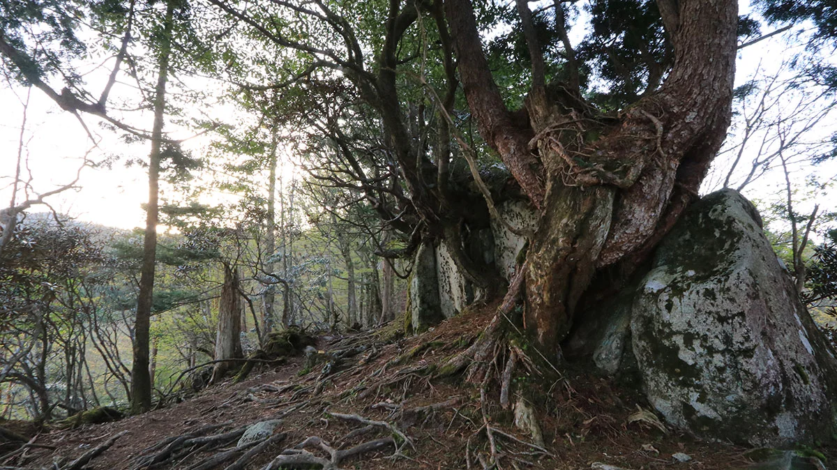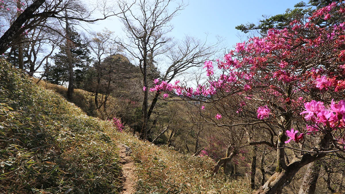 一旦、先ほど通過した、大峯奥駈道の分岐まで戻り、そこから大日岳へ向かう。これまで整備された歩きやすい道だったが、この区間は不安定なトラバース道が続くため、下側に引っ張られる力が強く、歩きにくかった。トピックスとしては、途中に第39の靡、都津門(とつもん)があることと、この区間はツツジが何箇所か咲いていた。