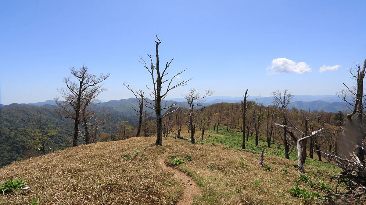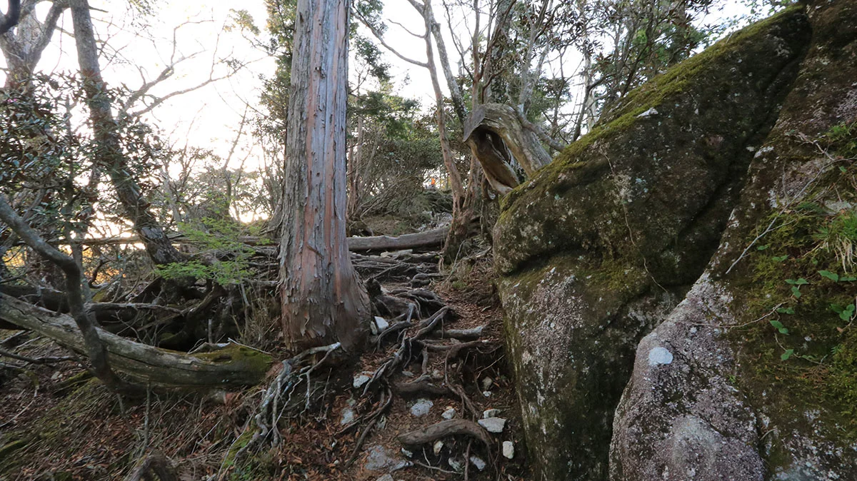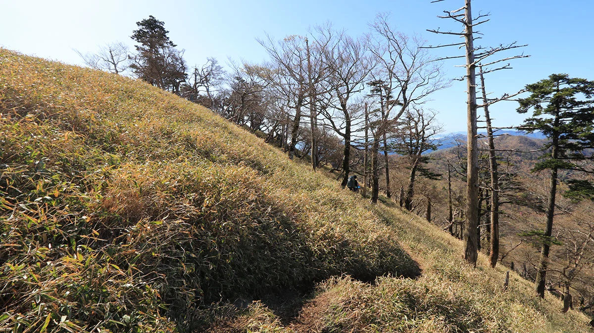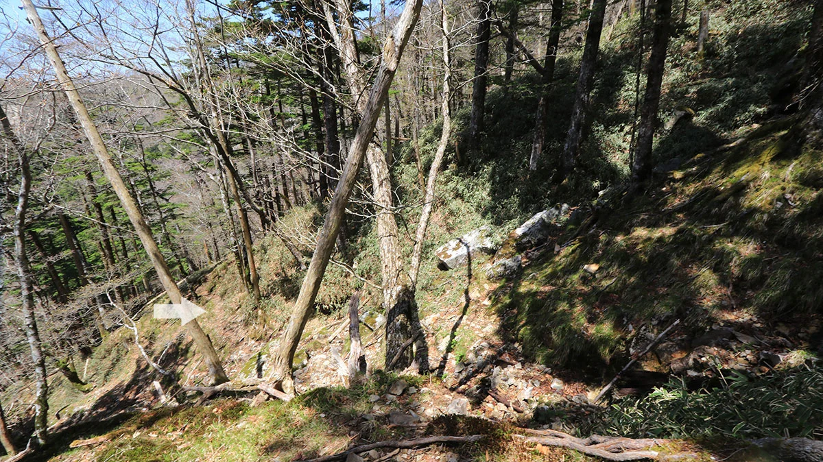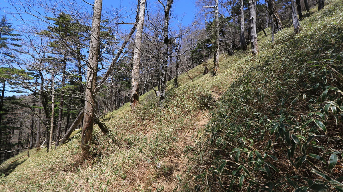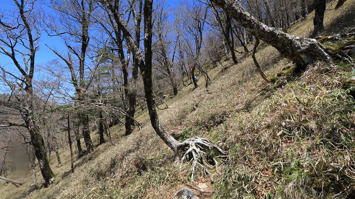 中間地点を過ぎたあたりで登山道から外れてしまう。途中までトレースはあったが気づけば道が途絶えてしまったため、GPSで位置確認。すると登山道の下を歩いていることが判明したので、ひとまず道を戻る。すると、深仙の宿方面から登山者がやってきたため、一緒に歩くことに。しかし進んだ先は、やはりさっきと同じ場所。また、戻るのが面倒になったので、結局強引に藪漕ぎしつつ真上に進んで、登山道に復帰した。道を間違えたことで、なんか精神的に疲れてしまった。途中までトレースがあったので、自分と同じように道を間違えた人が一定数いるはずなので、この区間は要注意。"道がおかしい"と思ったら戻ること。