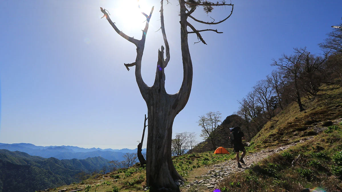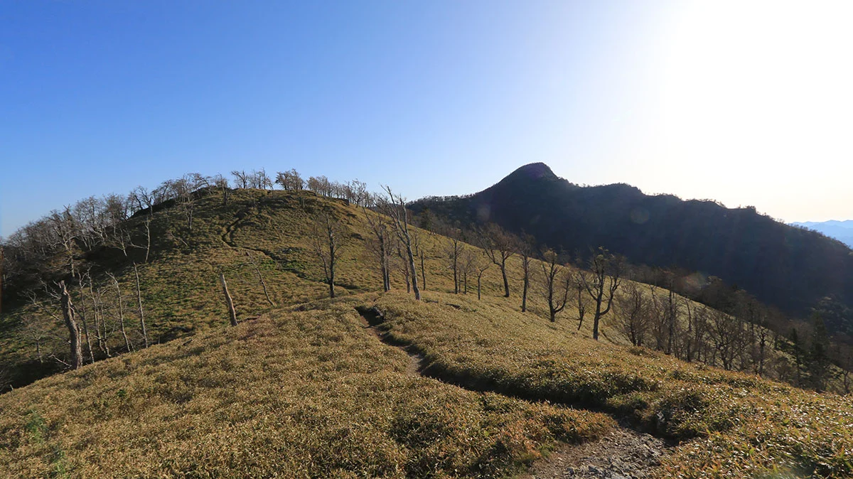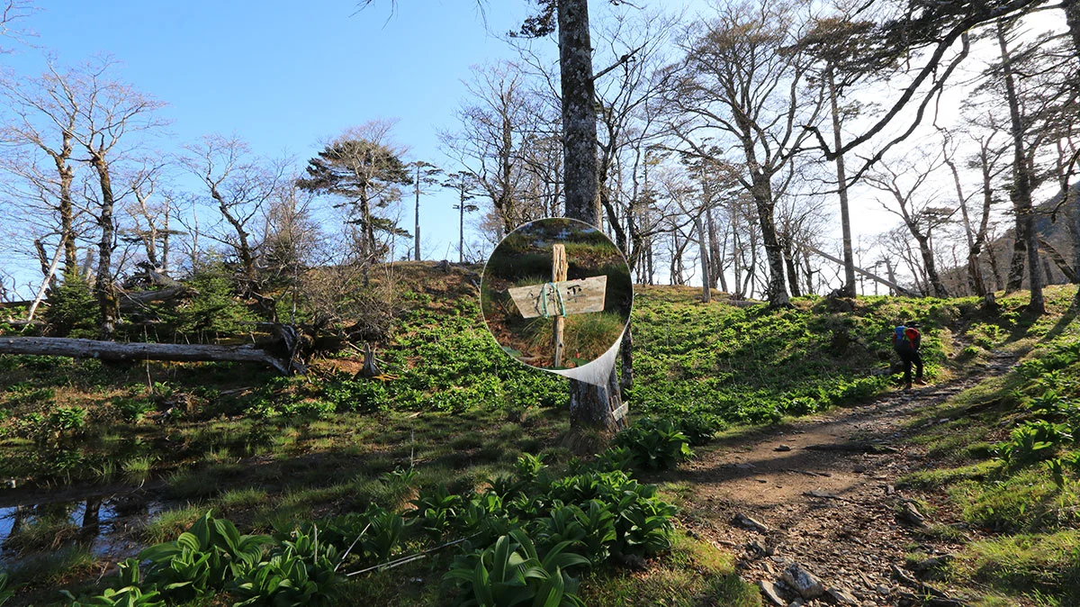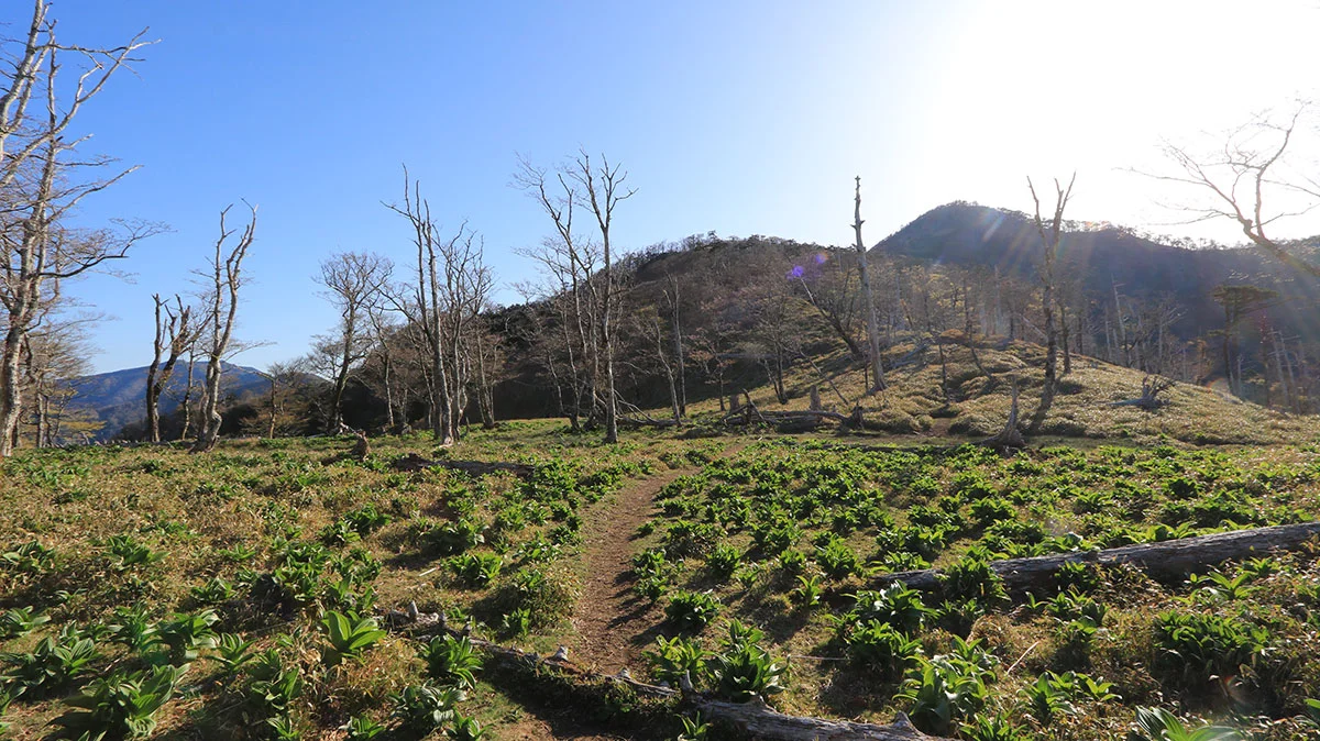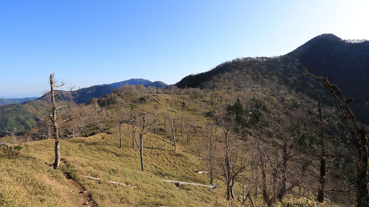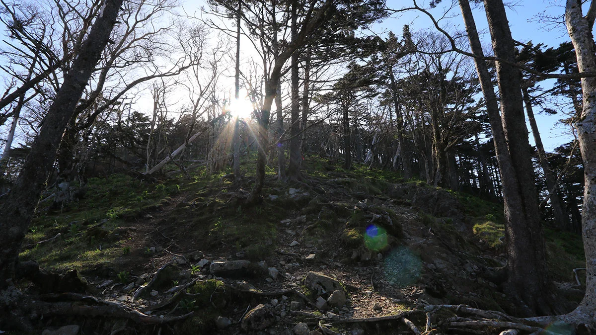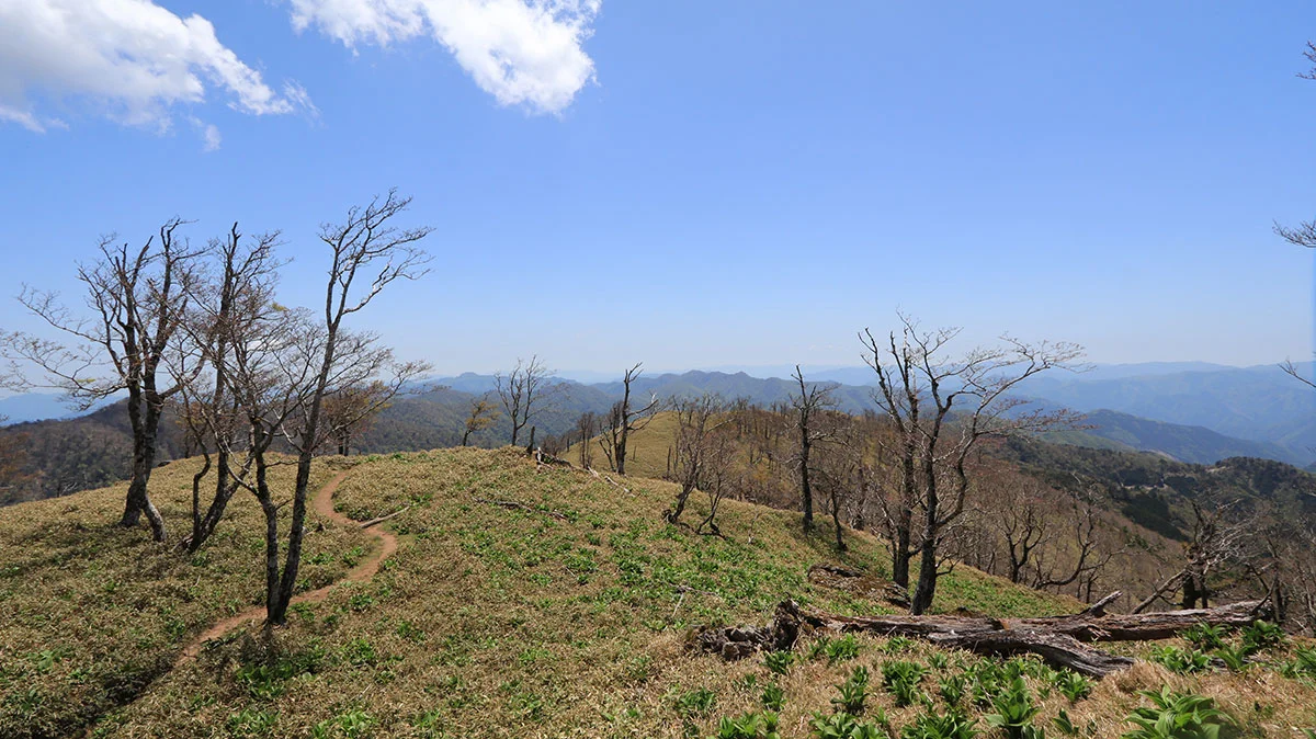 中間地点を過ぎたあたりで登山道から外れてしまう。途中までトレースはあったが気づけば道が途絶えてしまったため、GPSで位置確認。すると登山道の下を歩いていることが判明したので、ひとまず道を戻る。すると、深仙の宿方面から登山者がやってきたため、一緒に歩くことに。しかし進んだ先は、やはりさっきと同じ場所。また、戻るのが面倒になったので、結局強引に藪漕ぎしつつ真上に進んで、登山道に復帰した。道を間違えたことで、なんか精神的に疲れてしまった。途中までトレースがあったので、自分と同じように道を間違えた人が一定数いるはずなので、この区間は要注意。"道がおかしい"と思ったら戻ること。