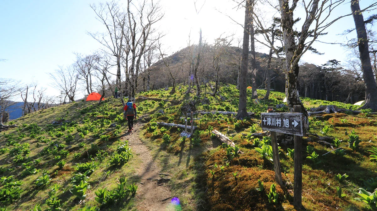 千丈平(せんじょうだいら)はテント場になっており、何張りかテントが張られていた。それと、千丈平は釈迦ヶ岳の山頂を経由しないで、大日岳へ向かう巻き道の分岐地点だが、分岐に道標がなく、このときは気づかずスルー。ちなみに、分岐を少し進むと「かくし水」と呼ばれる水場がある。詳細は復路で。