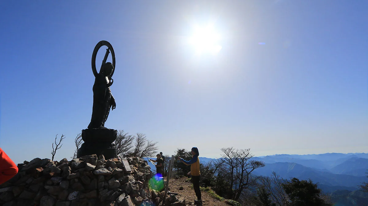 山頂には、釈迦ヶ岳の象徴である観音様がたたずんでいます。全長4m弱ほどありそうで、結構でかい!山頂スペースは、中央に観音様で、その周囲が休憩できるスペースになっているが、あまり広いとは言えない山頂。釈迦ヶ岳は、大峯奥駈道にある75の靡のうち、40番目の靡となる。