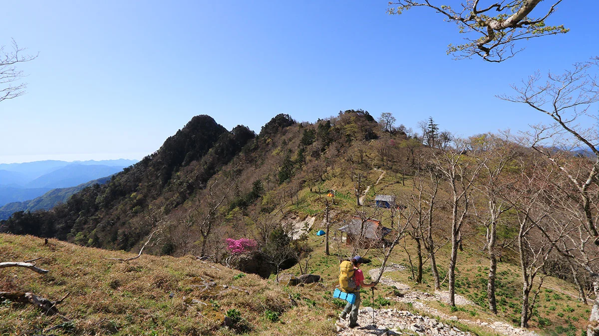 大日岳の岩場から撮影。釈迦ヶ岳の山頂と、左下に見える小屋が深仙の宿。
