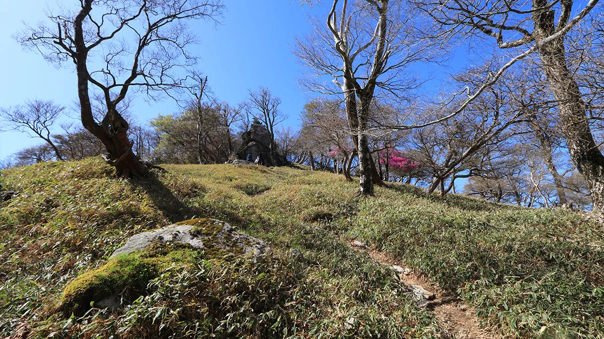 古田の森から釈迦ヶ岳の山頂までは、約1時間。古田の森を出発するとすぐに、釈迦ヶ岳の山頂をとらえることができる。