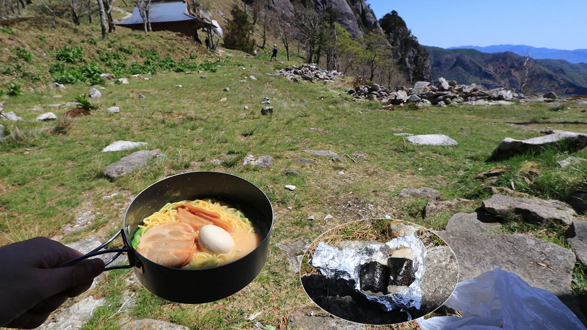 小屋の庇(ひさし)の木陰に腰をおろして、早めの昼食。この、深仙の宿だが、めちゃくちゃいい雰囲気。座り心地の良い芝生、鞍部のためか気持ちの良い風が吹いており、時折うぐいすの鳴き声も聞こえるという、素敵な空間でした。また、深仙の宿は、第38番目の靡でもある。