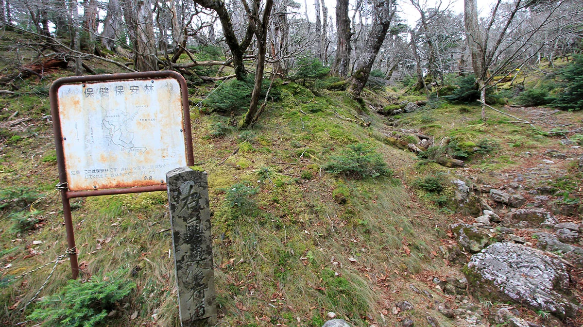 この女人結界門のあるあたりから、第六十三番目の行所でもある阿弥陀ヶ森を抜ける。中間目的地は小笹宿(こざさのやど)。途中にある小ピーク竜ヶ岳の北東を巻いて進む。小笹宿まで殆ど傾斜はなく、大半は平坦な道。女人結界門以降、コース上に史跡や石碑が目立つようになる。