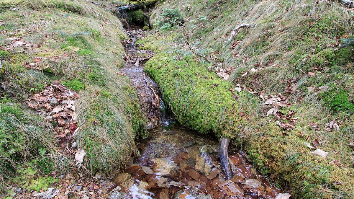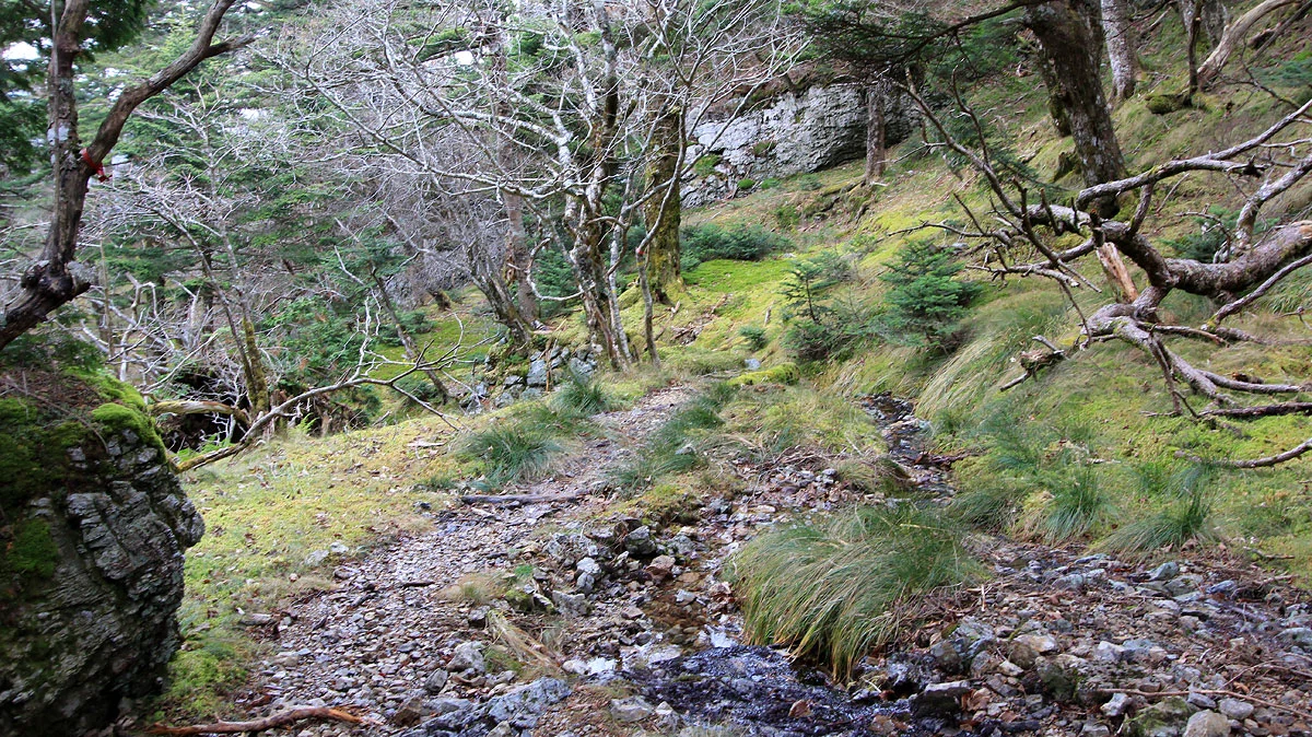小笹宿の手前から、登山道脇を水が流れだす。この水場は水量も多く、通年枯れることはないようだ。