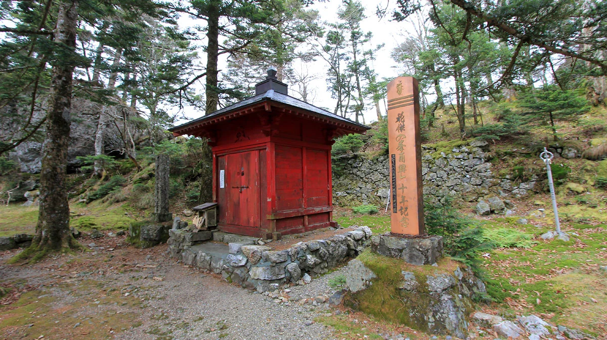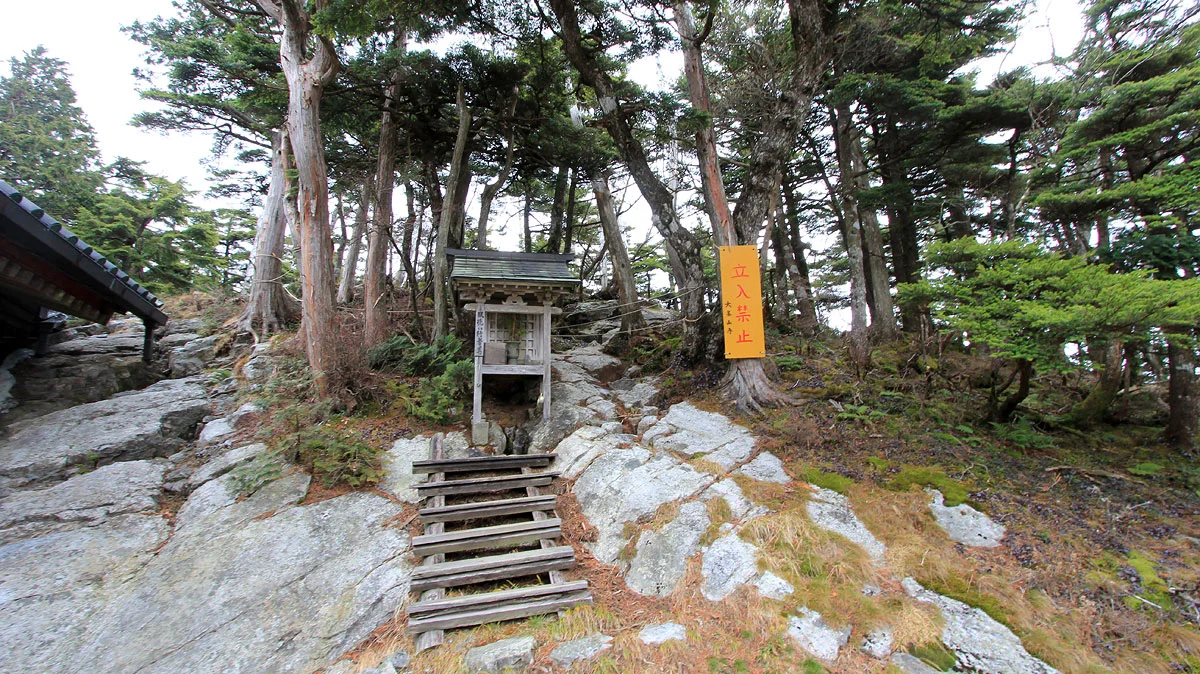 大峯山寺では洞辻茶屋から登る表参道を表行場(おもてぎょうば)と呼び、それに対し大峯山寺本堂裏手の平等岩、蟻の戸渡り、東ノ覗などの岩場を約1時間かけて巡る裏行場もある。ルートがわかりにくいため、裏行場を巡りたい方は、宿坊の案内人を頼むらしい。一先ずザックをデポして、裏行場の東ノ覗あたりを見てみようと、大峯山寺本堂の裏手に回るが、立入禁止の注意板。どうやらこの裏行場のコースは、戸閉後は閉鎖されているようだ。