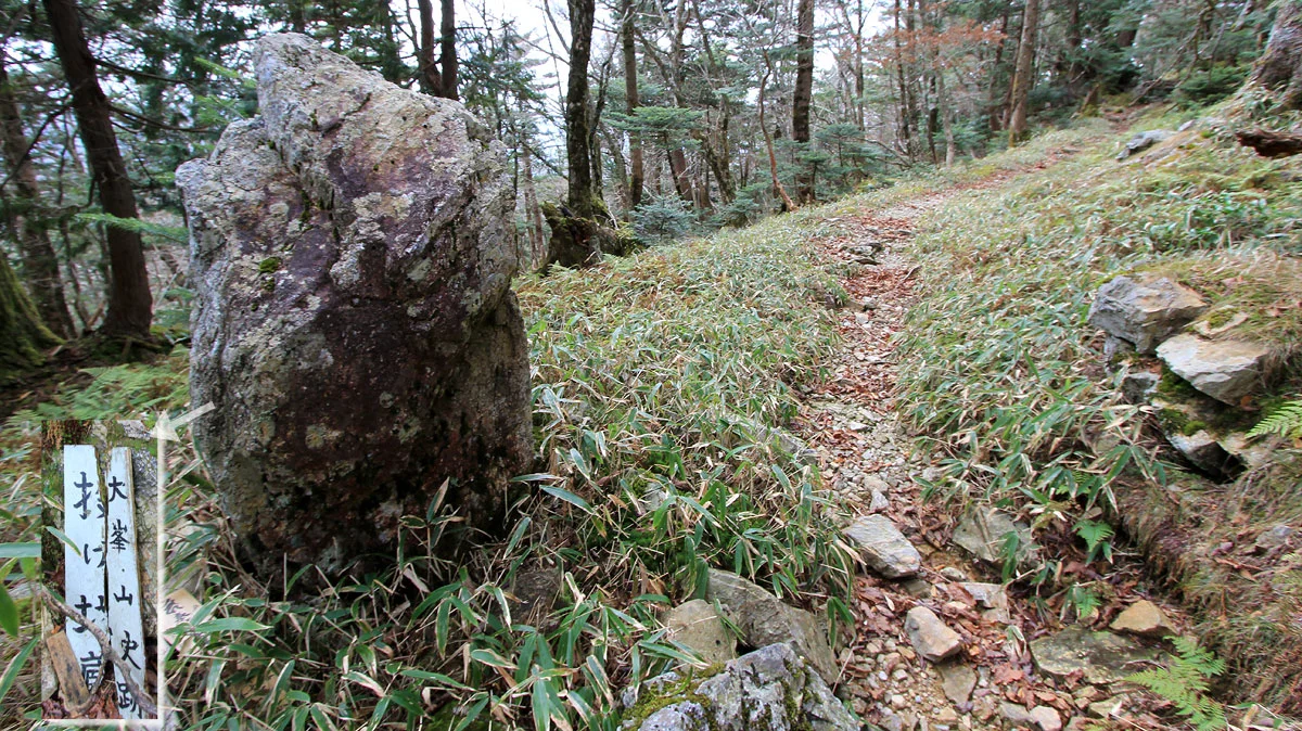 【11:51】投地蔵辻を通過。この投地蔵辻に、阿古滝経由で矢納谷出合(やのうだにであい)に抜ける分岐がある。しかし、柏木から長い林道歩きを強いられる上、山と高原地図では点線表示されている難コースのため利用者は少ない。ちなみに、唯一女人結界門を通らずに山上ヶ岳へ登頂できるコースでもある。