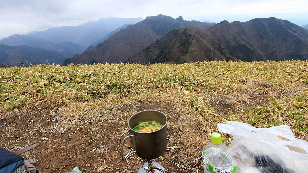 天気は幸い、曇ってはいるものの霧は出ていないので、展望は悪くない。お花畑の西側斜面に座ると見晴らしが良いので、そこで昼食を食べることにした。なお、お花畑の西側は、丸い斜面が緩やかに下に向かって沈み込んでいるため、無理して先端まで行き過ぎると危ないかも。
