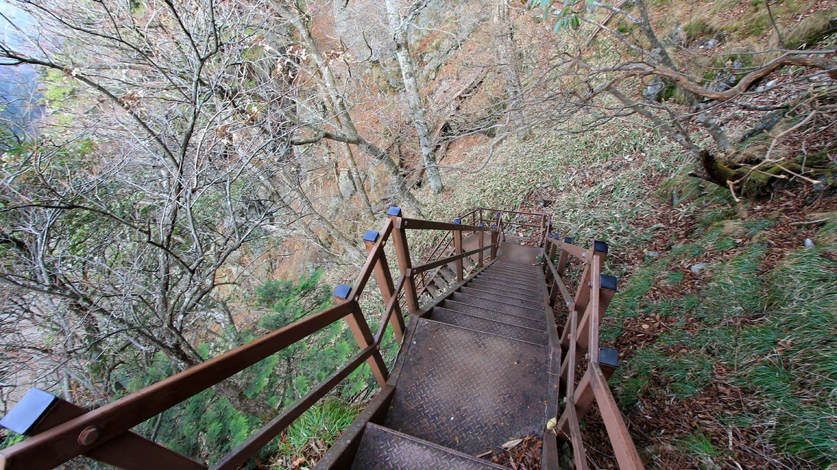 次なる中間目的地は女人結界門のあるレンゲ辻。出発直後から鉄の階段を下る急下降の道。鉄の階段がなければ相当危険で厄介な道だが、鉄の階段があるおかげで安全に下ることができる。手すりもあるので、木のハシゴより数倍安全。ただし、階段以外は、細い尾根の切り立った場所を歩くため、注意は必要。